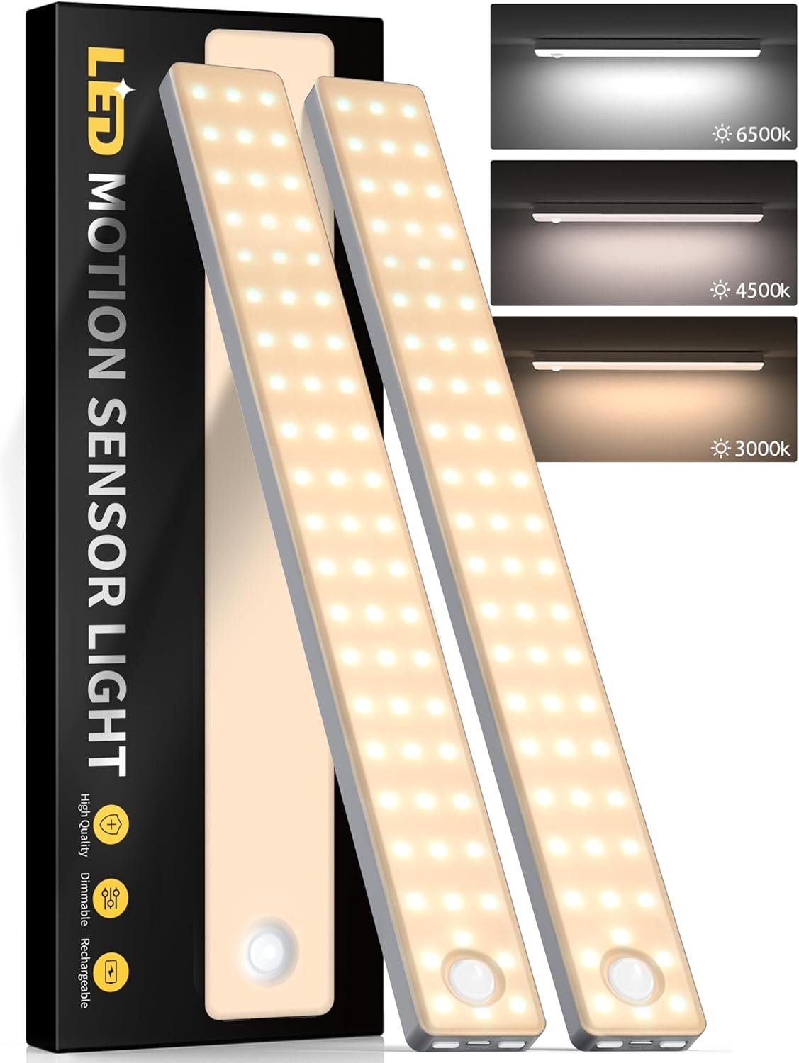 Under Cabinet Lighting,3 Color Temperatures Motion Sensor Light Indoor 2 Pack, USB Rechargeable Battery Operated Closet Lights, Wireless Dimmable LED Cabinet Lights, Under Counter Light for Kitchen