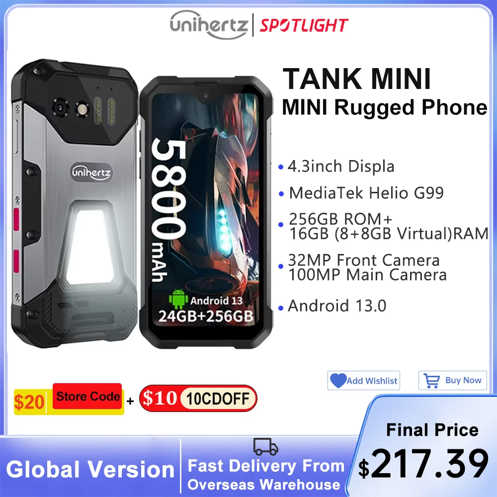Unihertz 8849 Tank Mini Rugged Smartphone 4.3 Inch Display Android 13 5800mAh 24GB 256GB Helio G99 Octa Core 100MP Cameras IP68