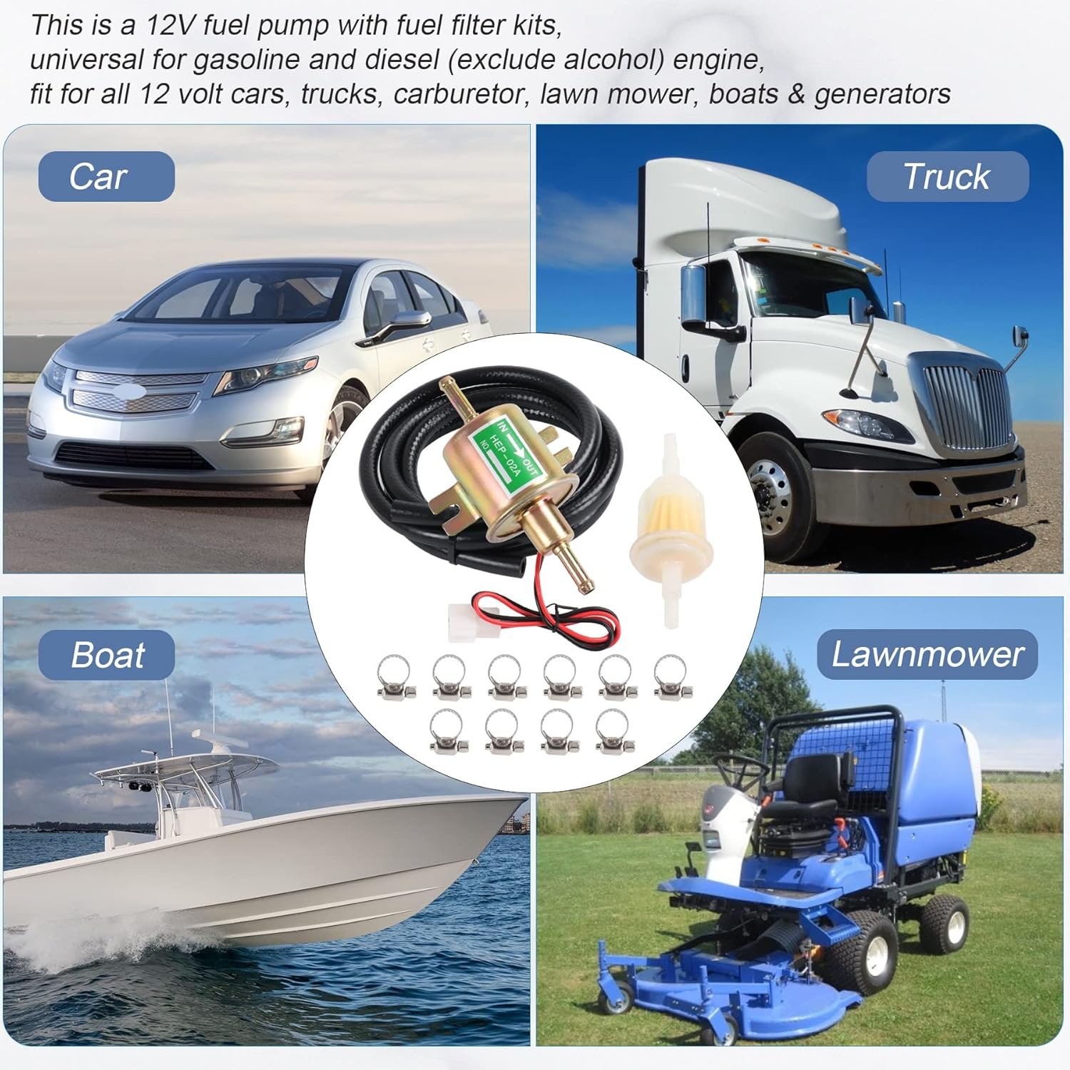 This is a 12V fuel pump with fuel filter kits, universal for gasoline and diesel (exclude alcohol) engine, fit for all 12 volt cars, trucks, carburetor, lawn mower, boats & generators
