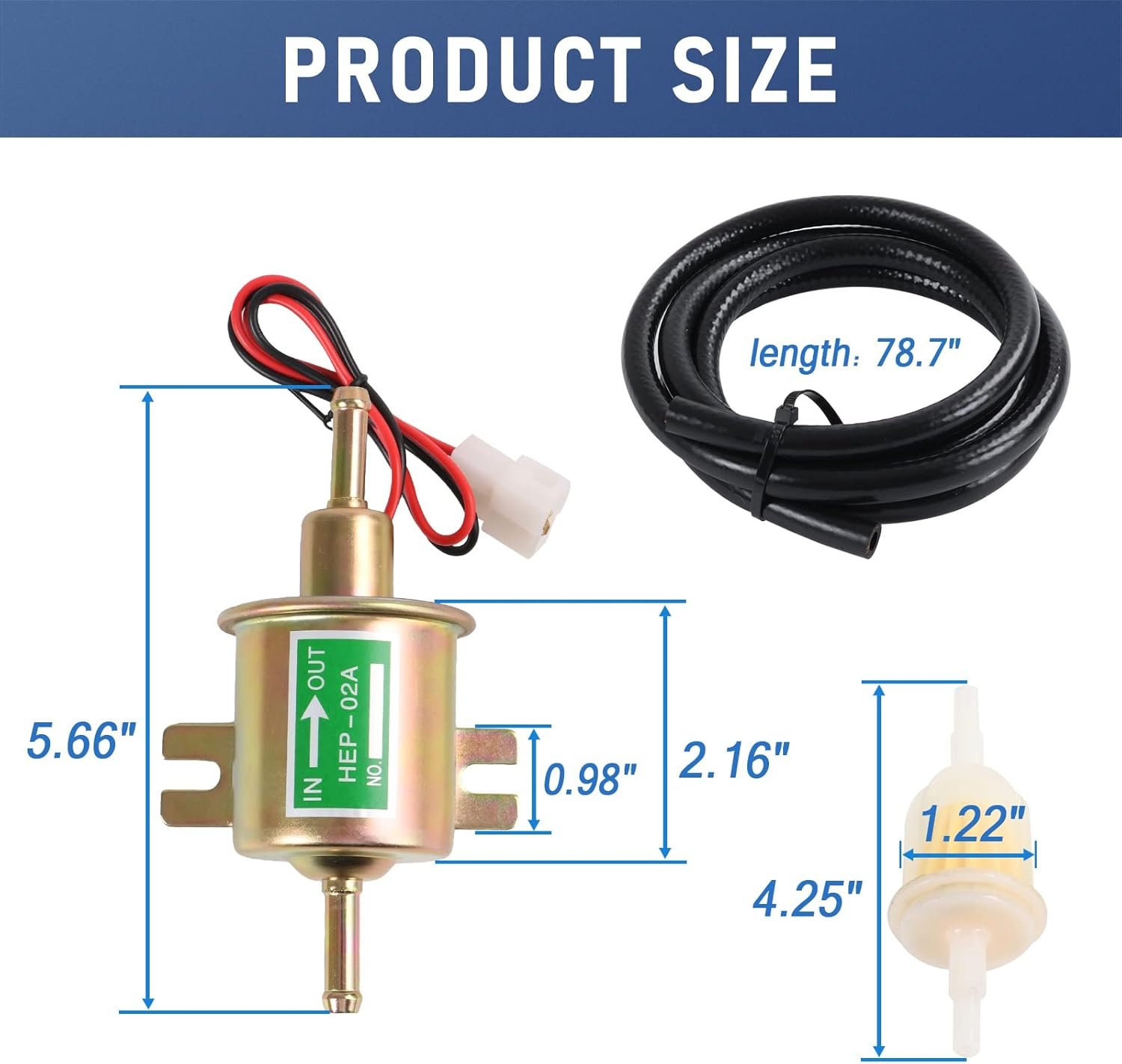 Low Pressure Fuel Pump: Voltage: 12 Volt, Output Pressure: 3-6 PSI, Flow Reaches: 70 L/H, Hose Size: 8 mm ( 5/16 inch ), Material: Copper Clad Aluminum, Plunger-type of fuel supply; Upgrade check valve provides optimum traffic, reducing the noise of the pump so we can operate quietly