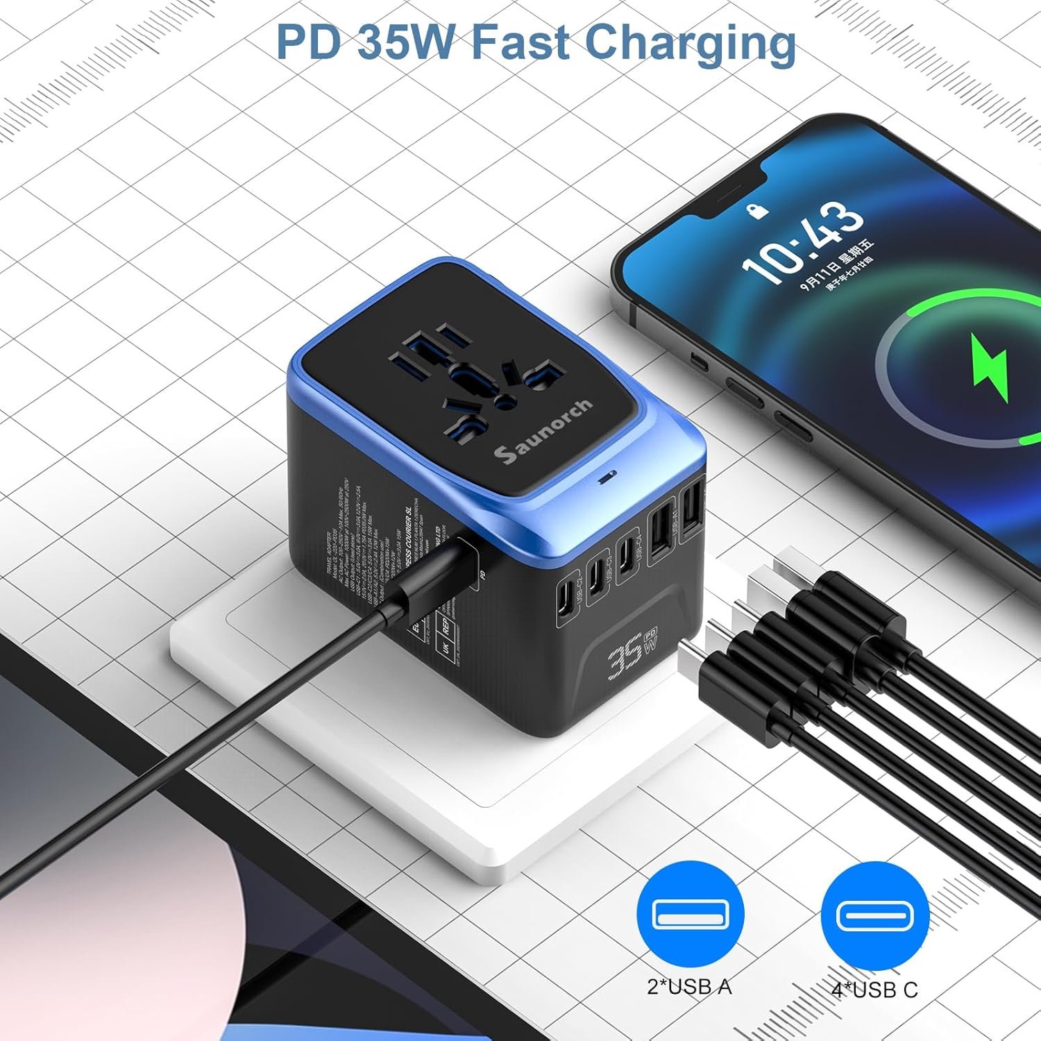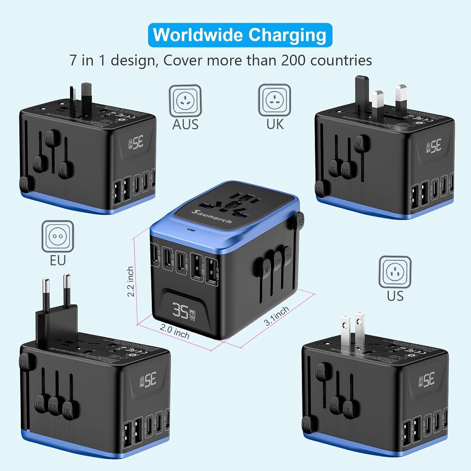 Universal Travel Adapter, PD 35W 7 in 1 International Power Plug Adapter with 7.0A 4 USB-C and 2 USB-A Fast Wall Charger, Worldwide AC Outlet for US Europe UK AUS (Black+Blue)