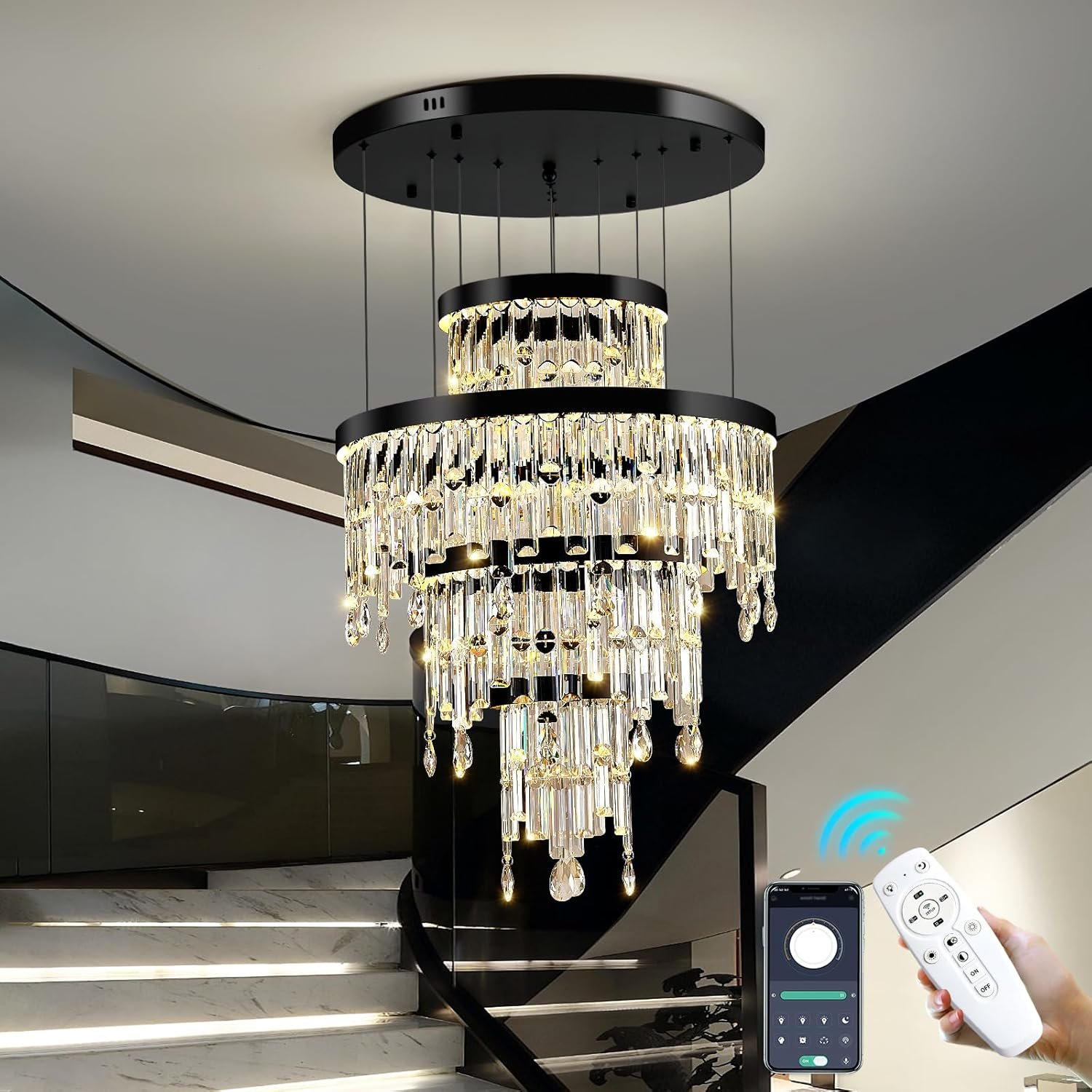 UOFUS Large Crystal Chandelier for High Ceiling 4-Tier Dimmable Modern Black Ceiling Pendant Light Fixture Raindrop Round Chandeliers Lighting for Entryway Staircase Foyer Living Room Dining Room