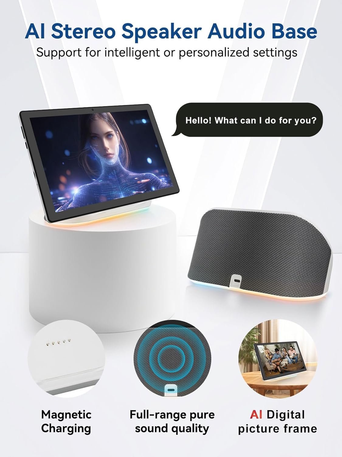 🎵【All-in-One AI Stereo Speaker Dock】Transform your Jeazans tablet into a multifunctional hub with the AI Smart Speaker Dock. Keeps it charged and ready 24/7 and doubles as a great-sounding speaker for room-filling music while ambient lights sync with your music for an immersive audio-visual experience. Dive into relaxation with 8 built-in white noise environments, or switch to the AUMI AI OS clock screensaver mode to use it as a digital clock. It doubles as an electronic cloud photo frame, showcasing your favorite memories. Combining charging, entertainment, and utility, this dock redefines tablet accessories.