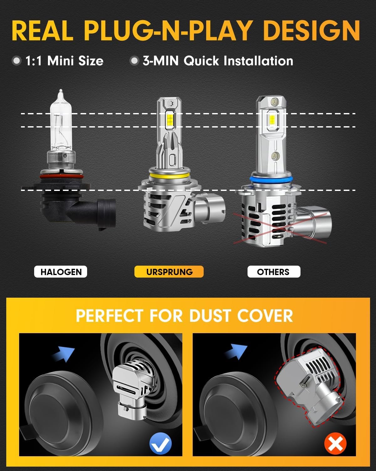 Effortless Installation in 5-MIN: Unlike other bulbs, Ursprung 9005/HB3 lamps are designed for easy installation without extra wiring. The integrated chips and fan in a compact unit save space and eliminate worries about fitting under the dust cover. Enjoy a hassle-free upgrade experience.