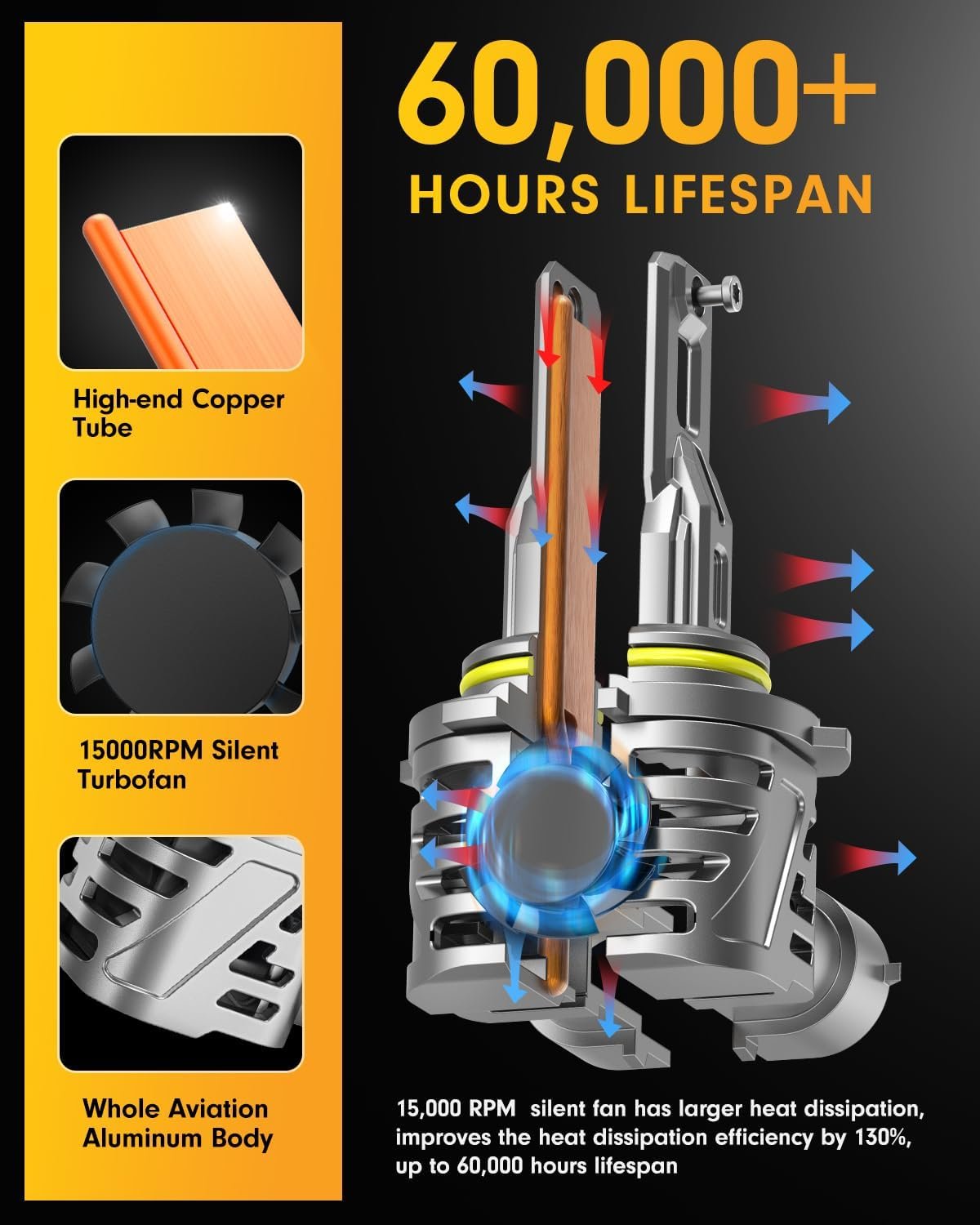 Extended Lifespan: Equipped with a built-in 12,000RPM high-speed cooling fan and crafted from aviation-grade aluminum, including the plugs, Ursprung 9005 bulbs ensure efficient air cooling to maximize their lifespan. Enjoy up to 60,000 hours of reliable lighting performance.