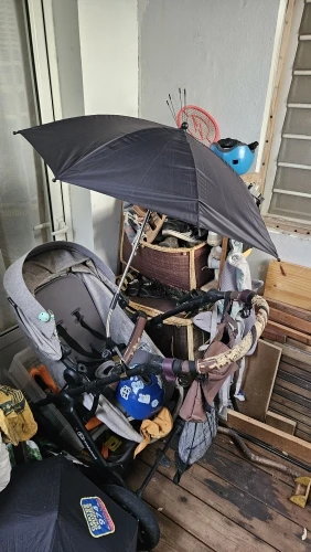 The umbrella is fine because it can be adjusted according to needs. It’s not very practical, especially since you can only adjust it back and forth and not left and right, but considering the price it’s excellent as the same product is much more expensive on other websites.