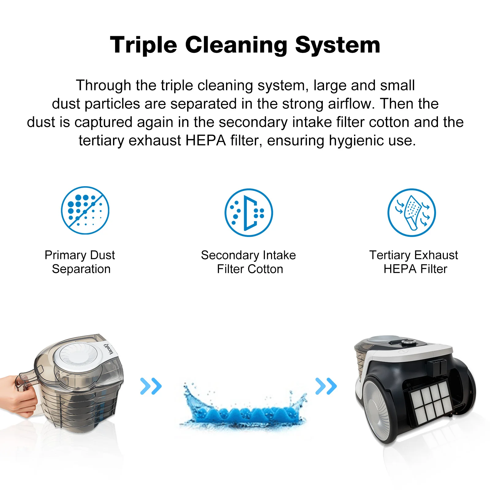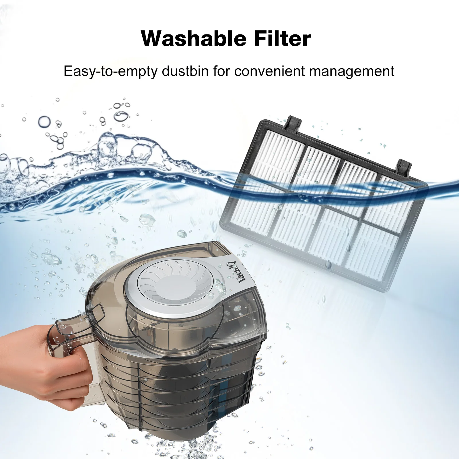 VacniQ BR5 bagless canister vacuum cleaner comes with large 2,5-liter dust cup, providing ample capacity for extended cleaning sessions. The filter and dust cup of this vacuum cleaner for home can be washed directly with water, making daily maintenance more convenient and provides no extra consumables and no additional costs.