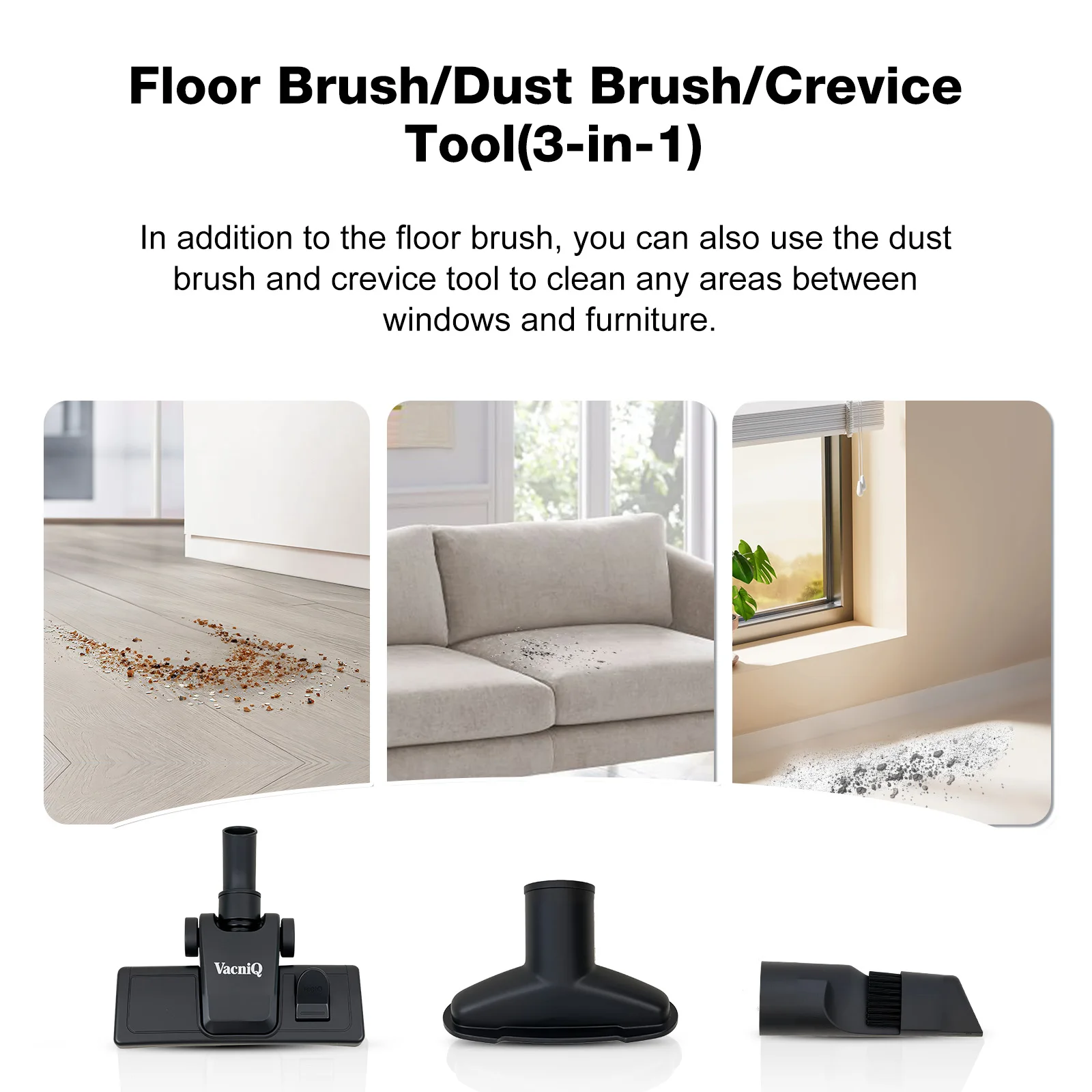Brushes: 3-in-1: Main Brush (Floor Brush) + Dust brush + Crevice Tool