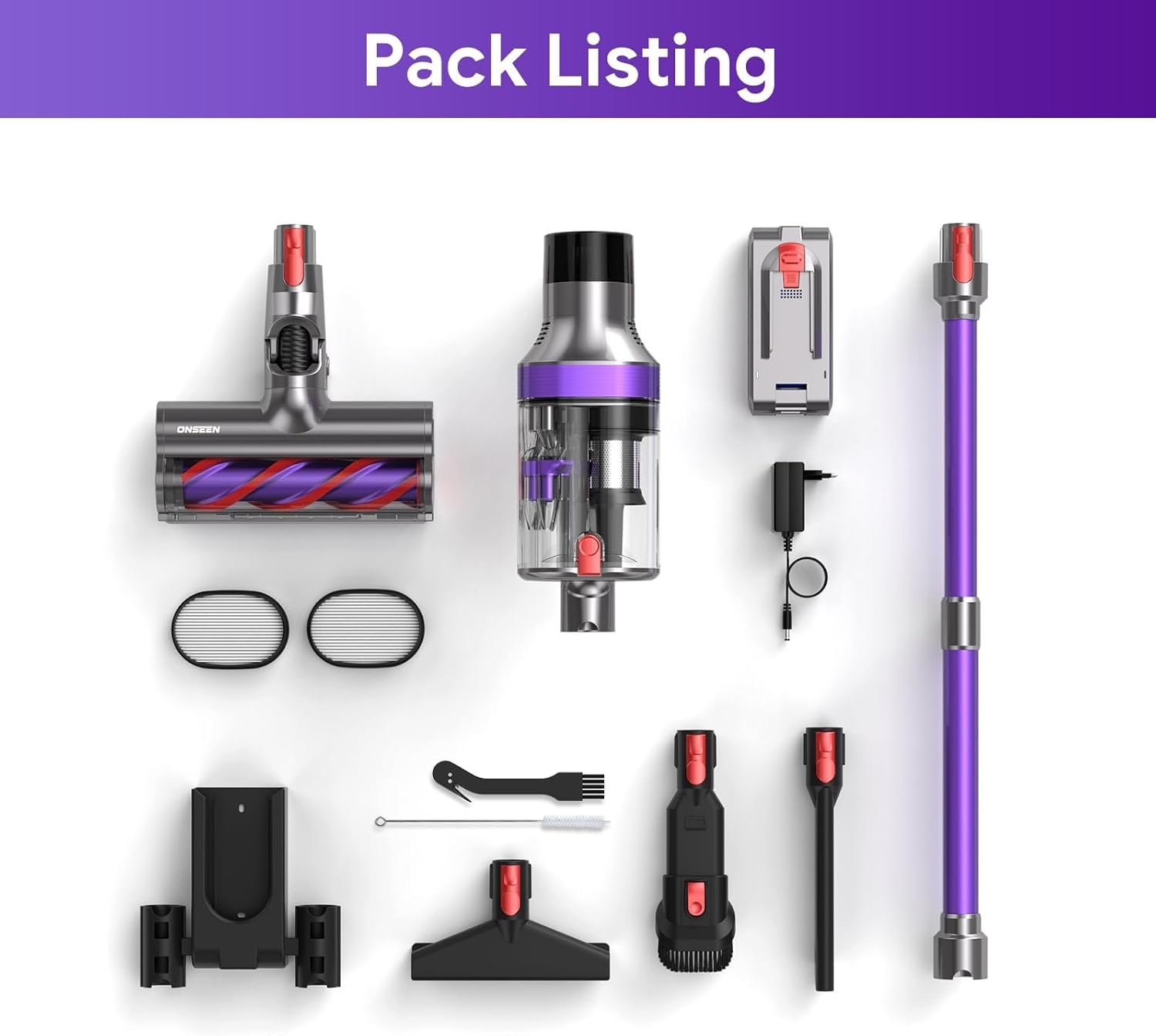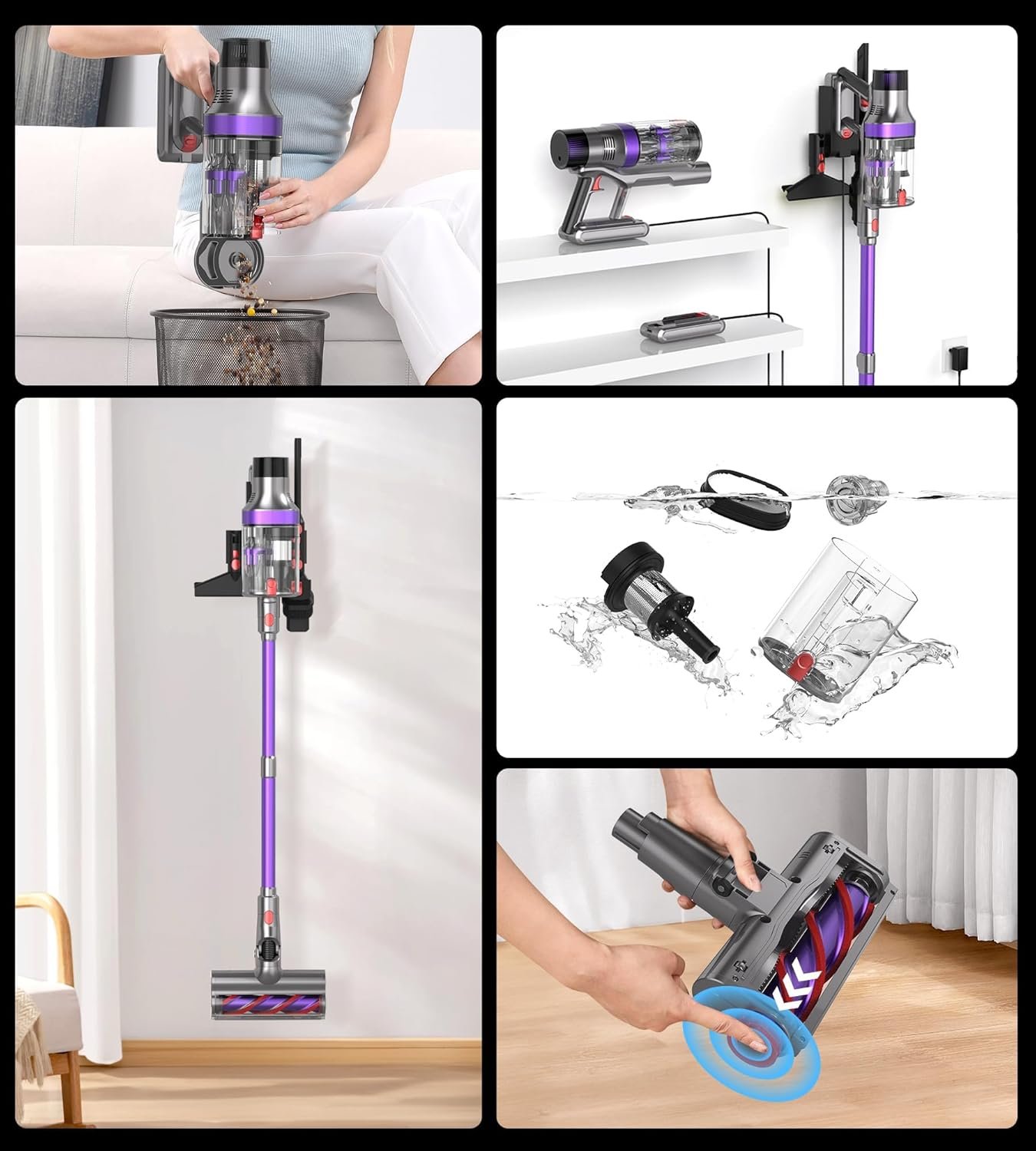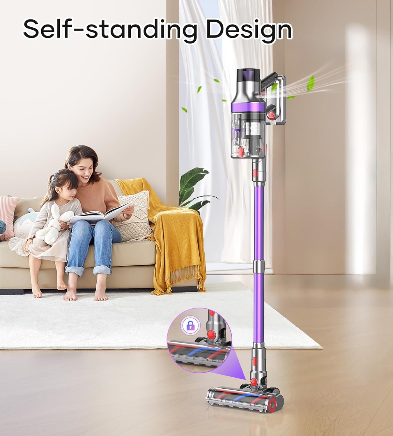 45Kpa Powerful Suction & 580W Upgraded Brushless Motor: The Cordless Stick Vacuum Cleaner is equipped with the latest upgraded brushless motor, which can provide 580W power, ensuring an unprecedented suction power up to 45Kpa. Easily and effectively removes dirt, snack crumbs, pet hair even on long-pile carpets