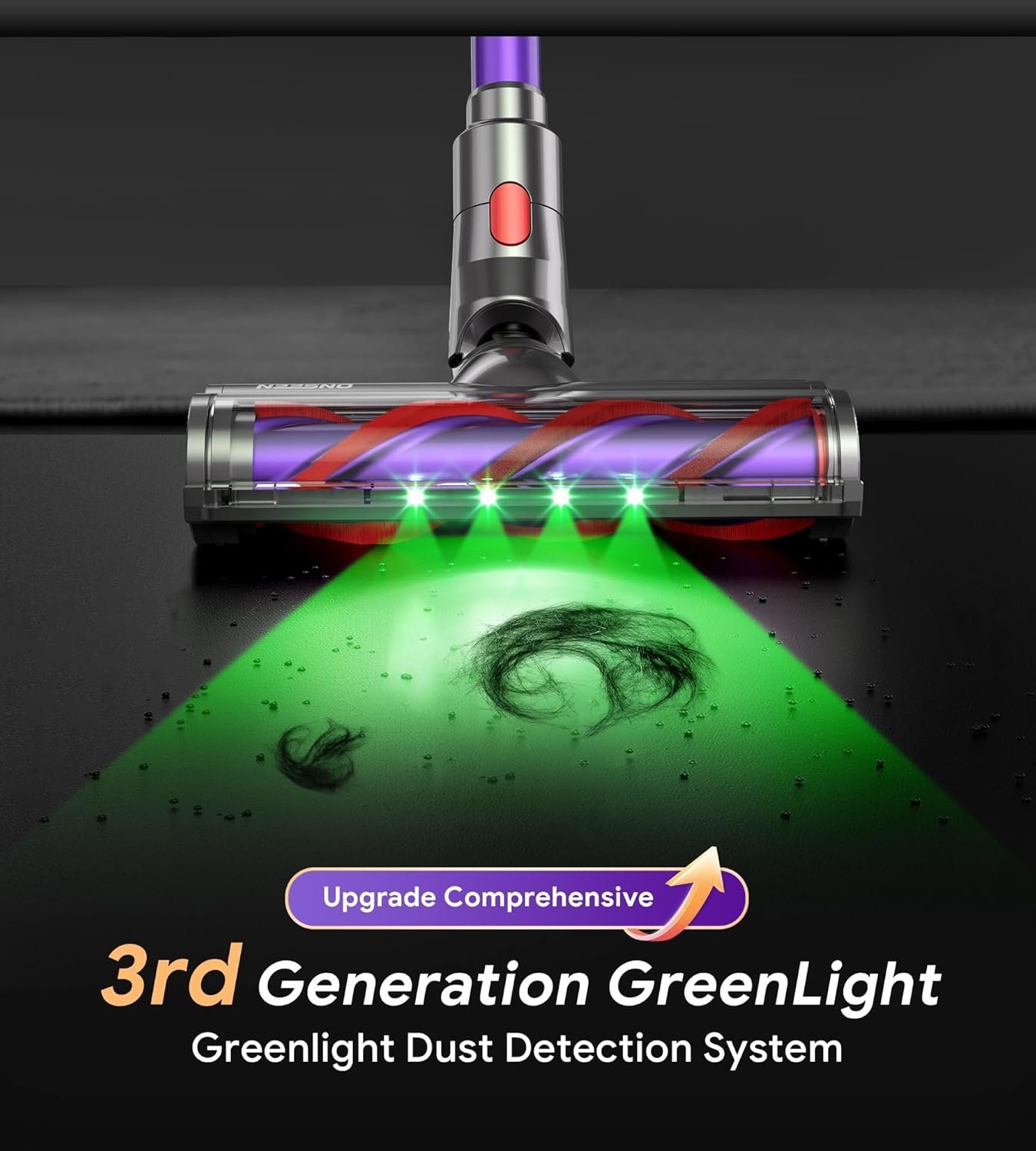 Rotating Brush Head with 4 Green LED Lights: The 4 green led headlights of vacuum cleaners for home can illuminate furniture in dark corners. Clean your home with ease with the flexible 180° swivel side to side and 90° up and down. Compared with white led, the green led can effectively map particles as small as 0.1um due to the scattering property of green light on dust