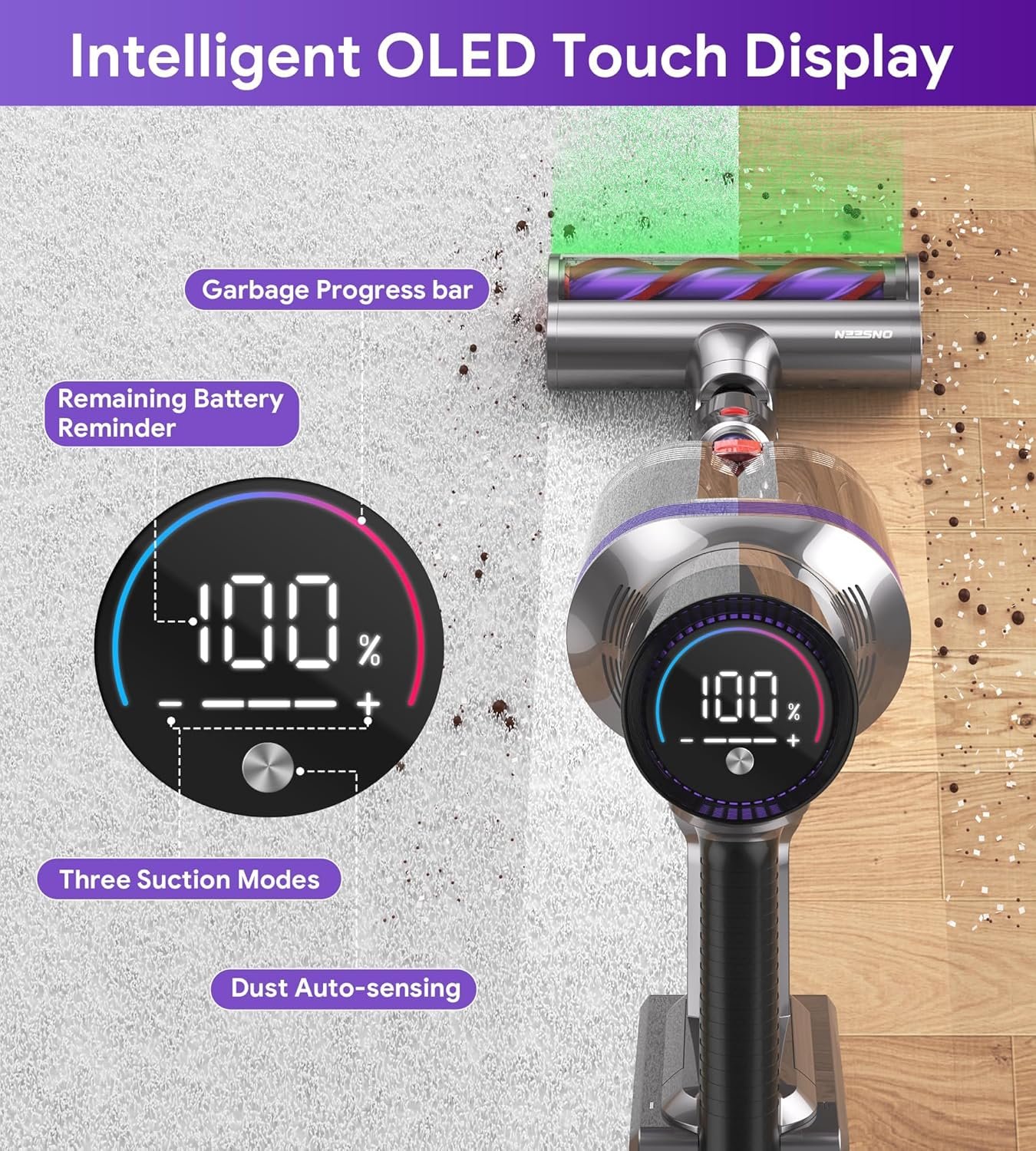 OLED Smart Panel: The stick vacuum built-in sensor, you can track the remaining battery power and the operating status of the vacuum cleaner via the OLED panel. When the roller brush/host is blocked, the OLED panel emits a red alarm to remind you. By pressing the “+/-” button, you can change the cleaning mode. (Eco/Standard/Boost/Extreme)