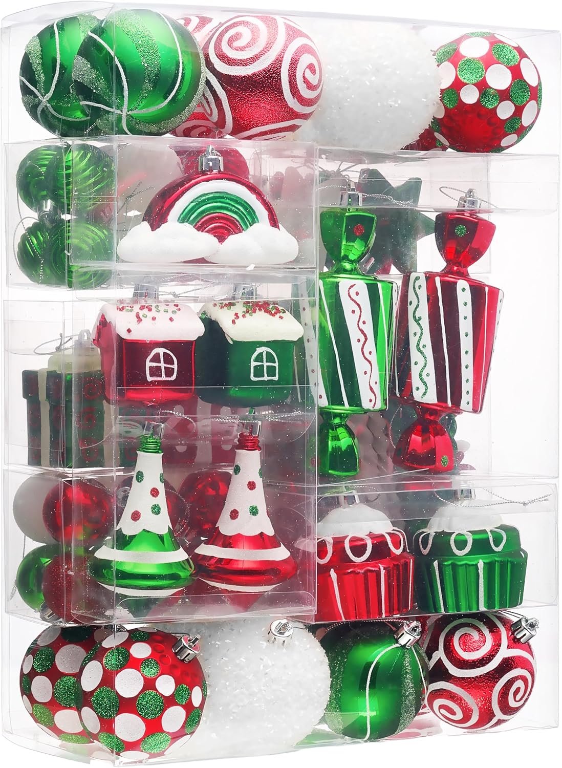 【Variety of Patterns and Molds】This set includes a variety of Christmas-themed ornaments, featuring stripes, dots, and swirl balls, as well as stars, candies, cupcakes, rainbows, houses, gift boxes, icicles, and snowflakes. The diverse shapes and designs complement each other well, adding interest and charm to your overall holiday decor