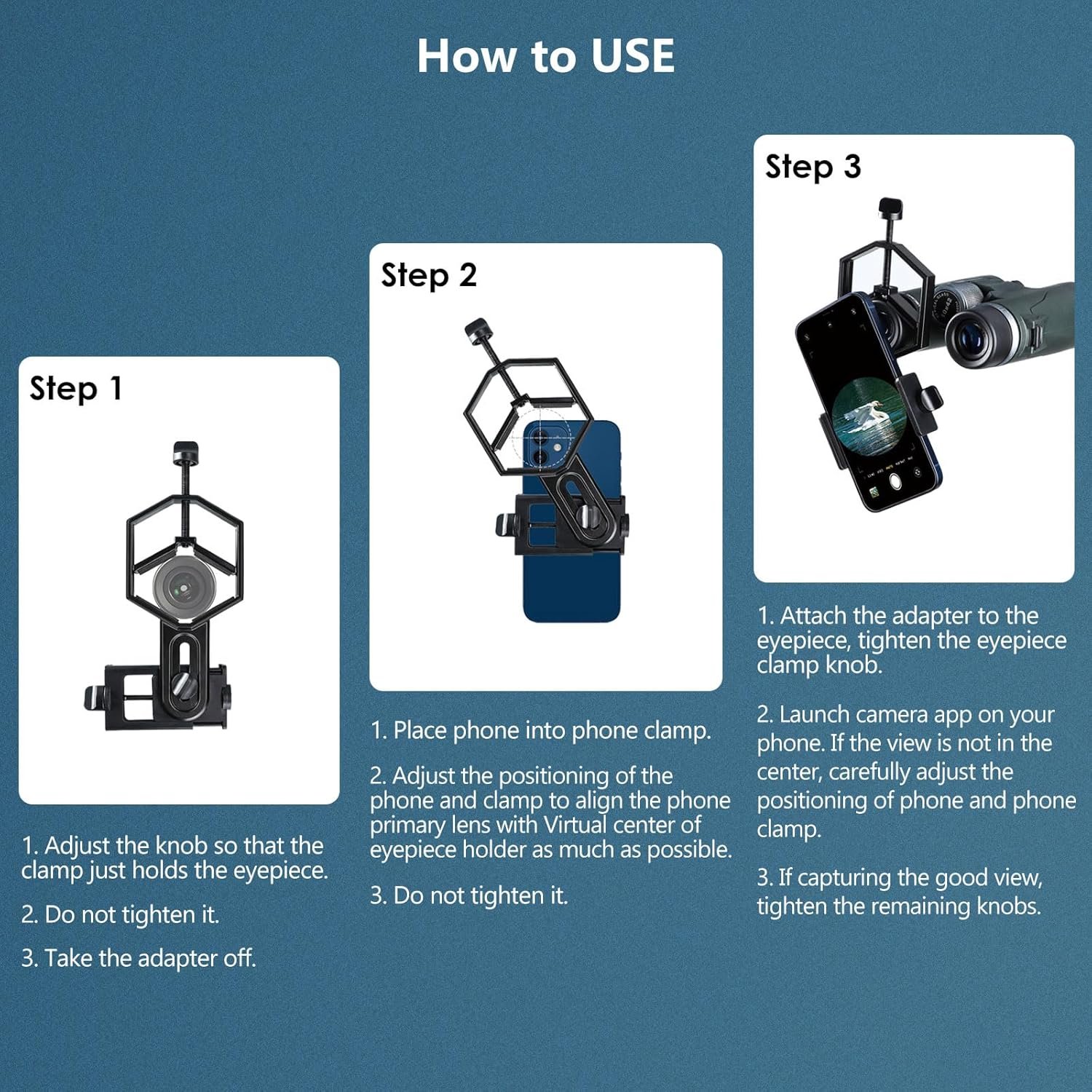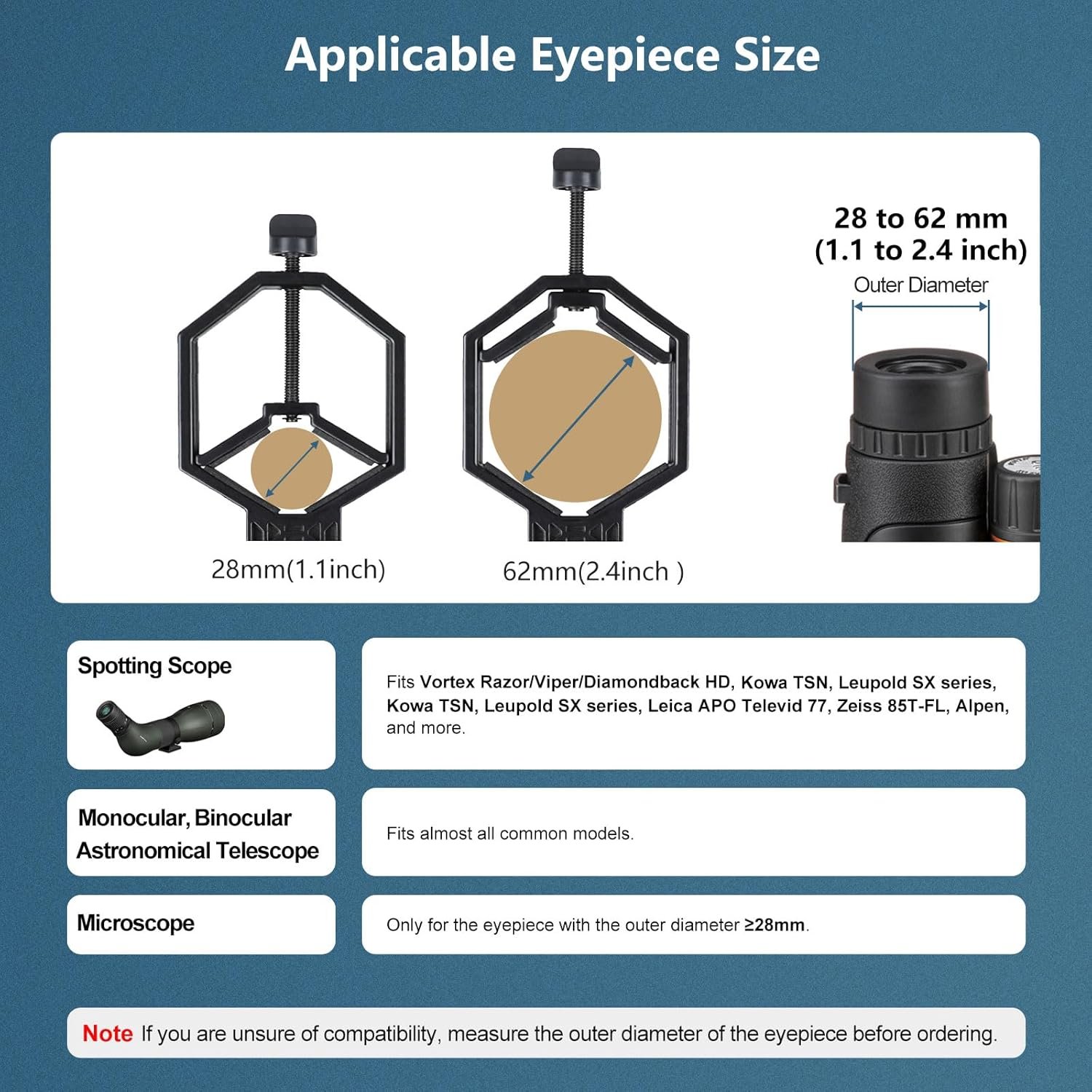 【Applicable Eyepiece Range】Fits the outer diameter range of eyepiece: 28-62 mm / 1.1-2.44 inch. Fits most of spotting scopes, binoculars, monocular, astronomical telescope..For microscopes, suggest measuring the outer diameter of your eyepiece before ordering, if less than 28mm, choose small version TMP09.