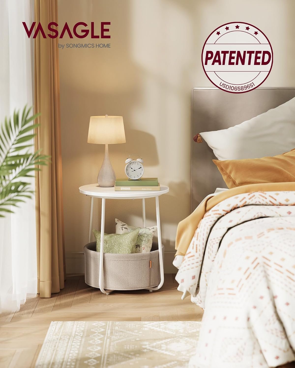 VASAGLE End Table, Small Bedside Table with Fabric Basket, Modern Nightstand, Round Side Table, for Living Room, Bedroom, Matte White and Camel Brown ULET223W10