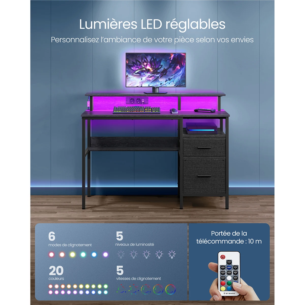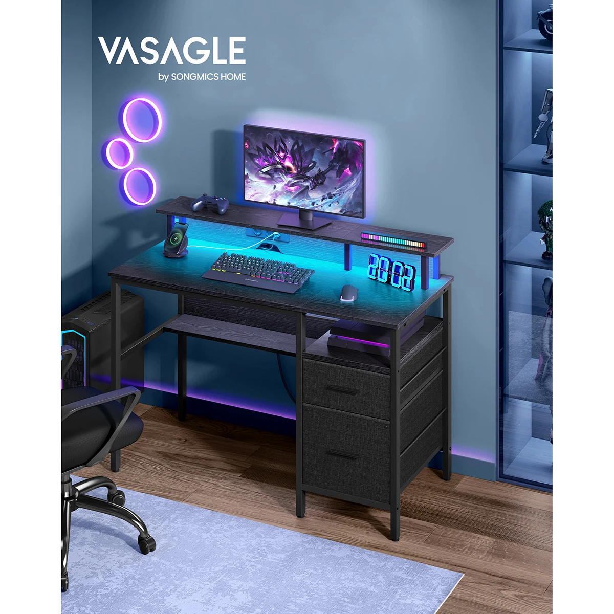 VASAGLE Gaming Desk with LED Lights and Power Strip, Computer Desk with Monitor Stand, Table with Storage, 2 Fabric Drawers