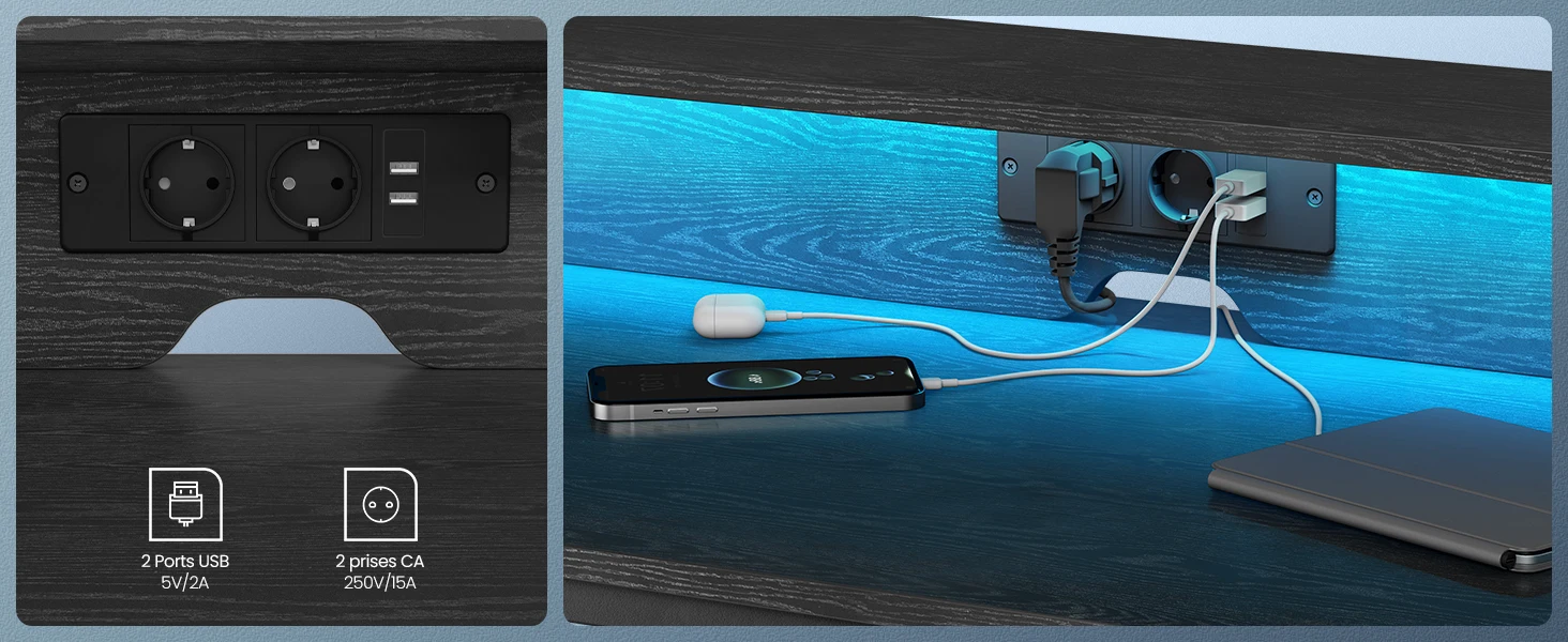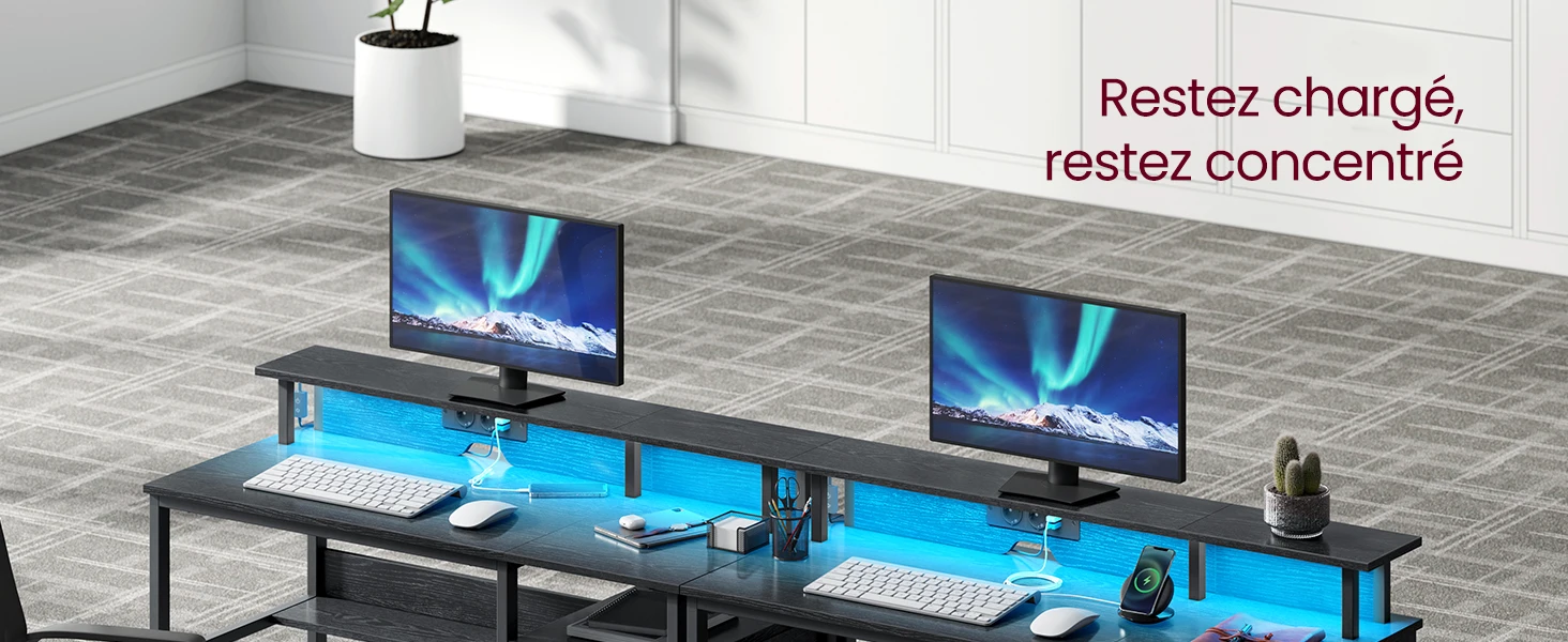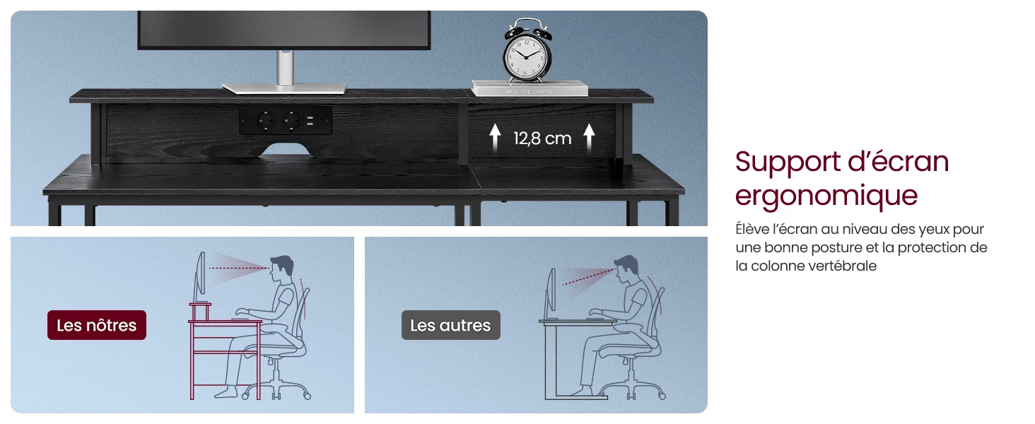 ã€RENFORCE VOTRE EFFICACITÉ】2 prises électriques et 2 ports USB permettent de recharger facilement téléphones,ordinateurs portables et autres appareils. En élevant l’écran à hauteur des yeux,le support de moniteur réduit les tensions au niveau du cou