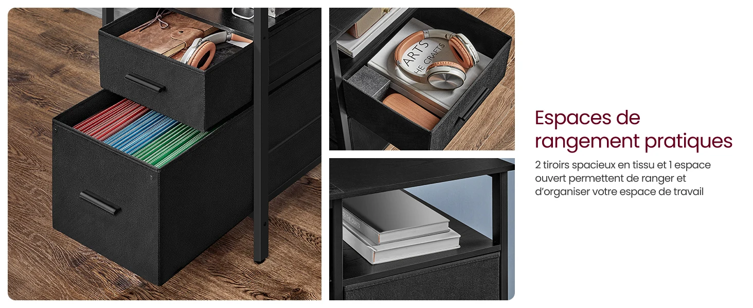 ã€SPACIEUX ET MULTIFONCTIONNEL】Grand tiroir pour les fournitures de bureau,tiroir à dossiers avec rails de suspension pour les chemises et rangement ouvert pour les livres. Parfait pour jouer ou travailler,ce bureau informatique répond à tous vos besoins