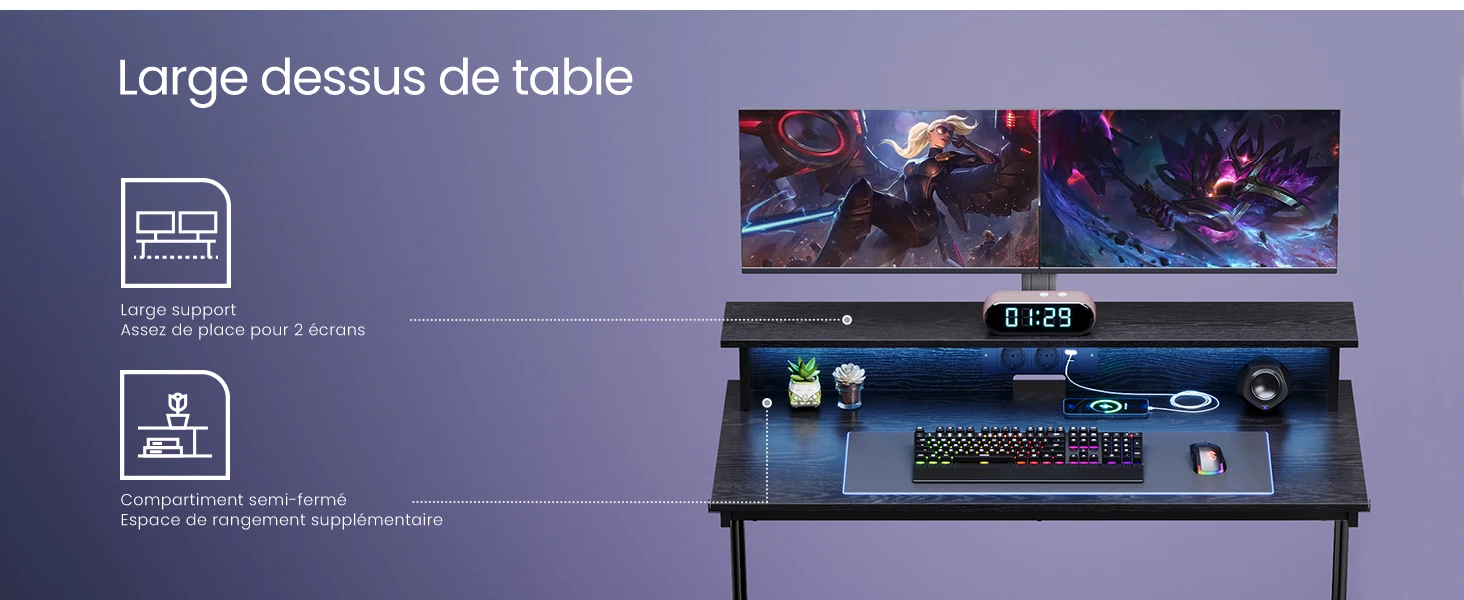 [Support ergonomique] Ce bureau est équipé d’un rehausseur pour mettre 2 écrans à la hauteur de vos yeux,il vous aide à réduire la fatigue au niveau du cou et du dos. Le compartiment en dessous est pratique pour ranger