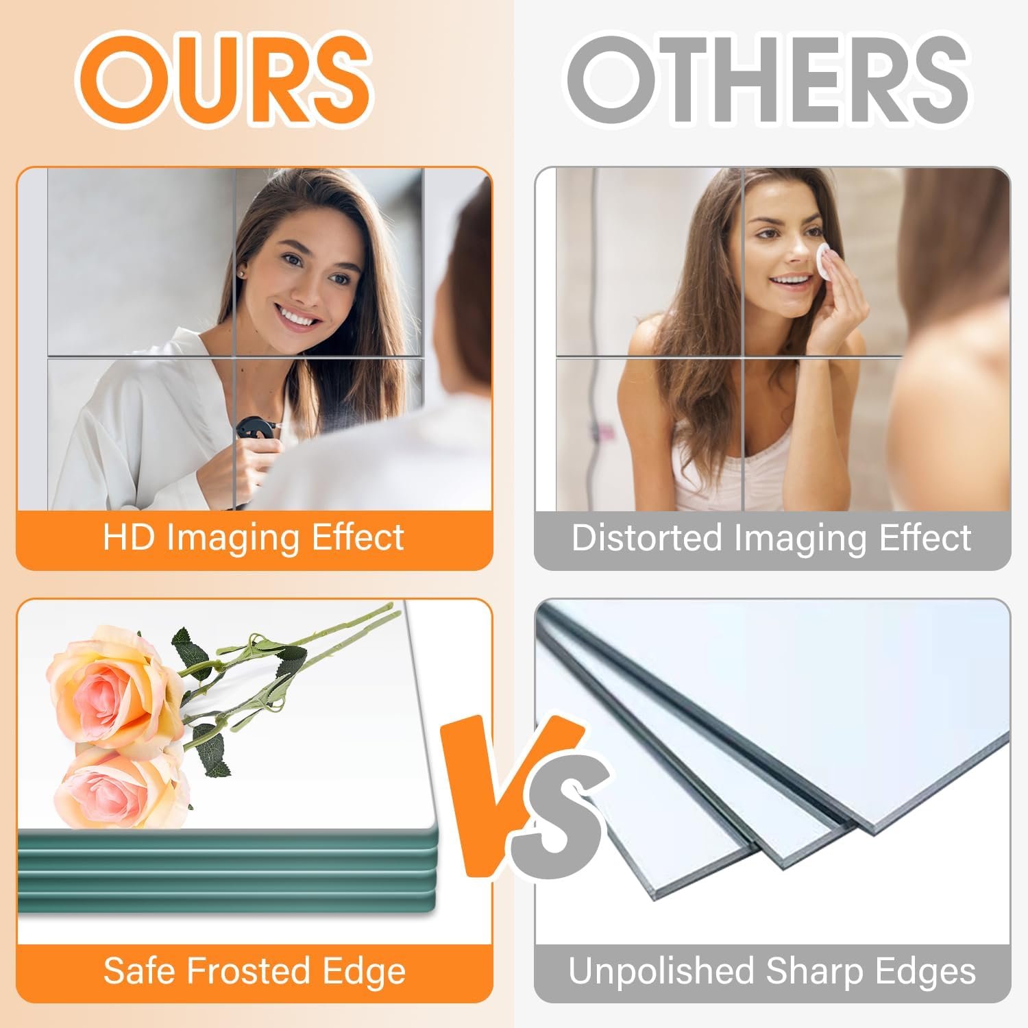 HD REFLECTIONS: Our frameless mirror tiles are crafted with high-definition float glass, ensuring exceptional clarity and durability. Experience a superior reflection with our premium mirrors. The frosted edge design adds an extra layer of safety and protection.