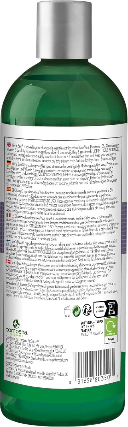 Vet’s Best Hypo-Allergenic Shampoo for Dogs | Dog Shampoo for Sensitive Skin | Relieves Discomfort from Dry, Itchy Skin | Cleans, Moisturizes, and Conditions Skin and Coat , 16 oz