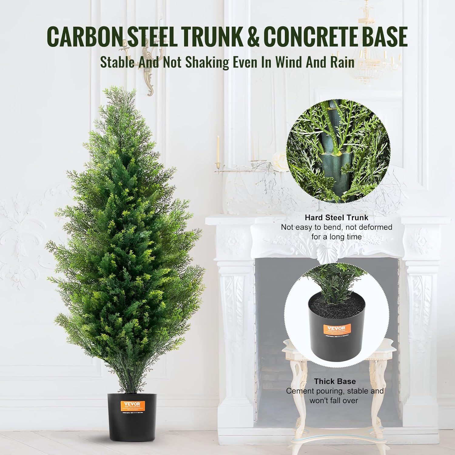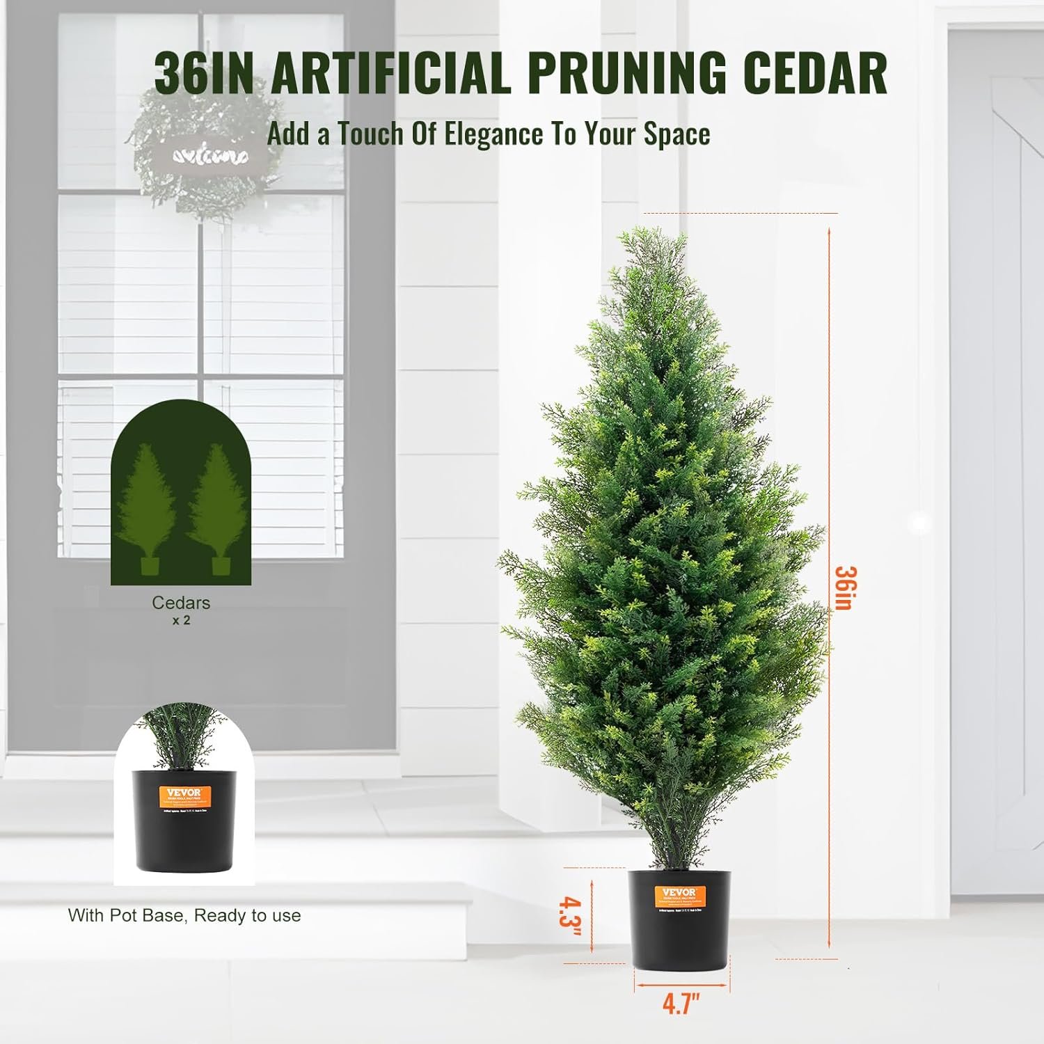 2 Pack 36” Cedar: Includes two 36-inch artificial cedars, each with a base pot for easy placement without replanting. Suitable for both indoor and outdoor use, perfect for decorating interiors, patios, doorways, and entrances.