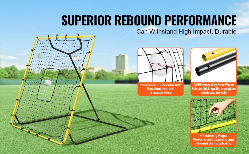 Full-Featured: The baseball net features 4 adjustable angles (40°, 62°, 84°, 106°) and target area settings, equipped with a 51-strand high-density PE rebound net for superior bounce. Helps practice catching and throwing skills at different angles, including high balls, line drives, and grounders.