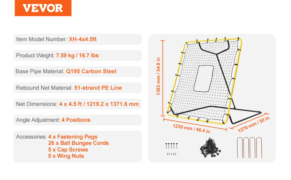 Flat Net Design: A 4 x 4.5 ft baseball rebound net with a flat net design, providing a larger usable area and high tolerance, perfect for baseball and softball. Suitable for beginners, professional players, and recreational games.