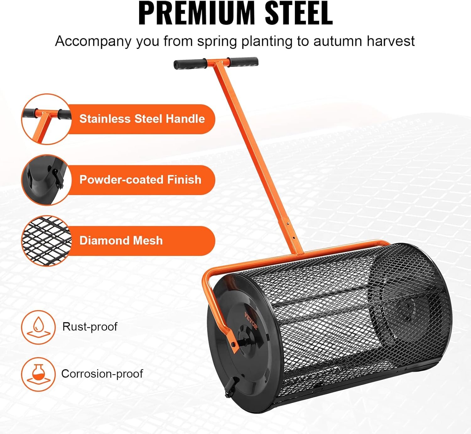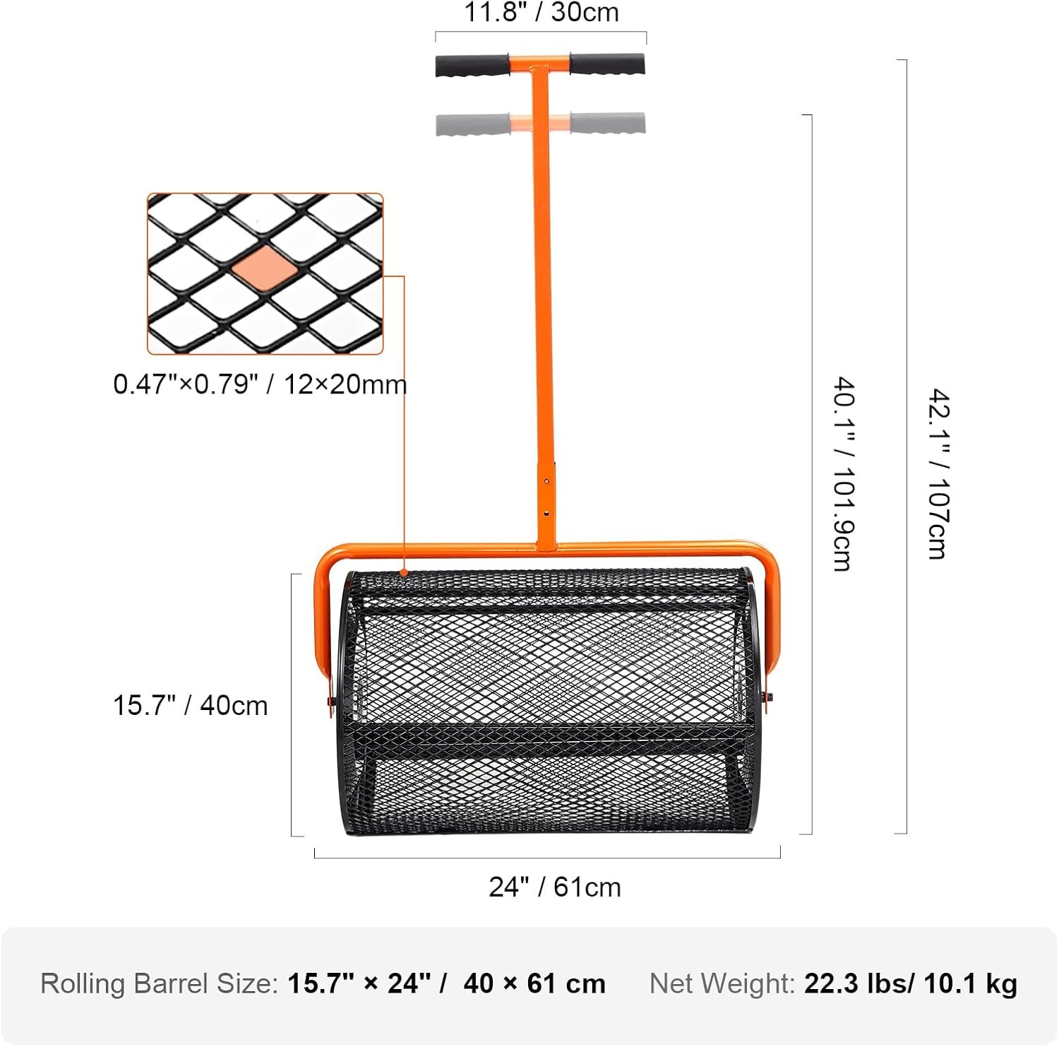 Upgraded Side Latches: You will be in constant control while spreading compost! The peat moss roller is designed with two of the latest side latches that will not be crushed during rolling on the lawn. The unique design ensures the basket remains closed during tipping and tumbling operations, making it durable and tidy.