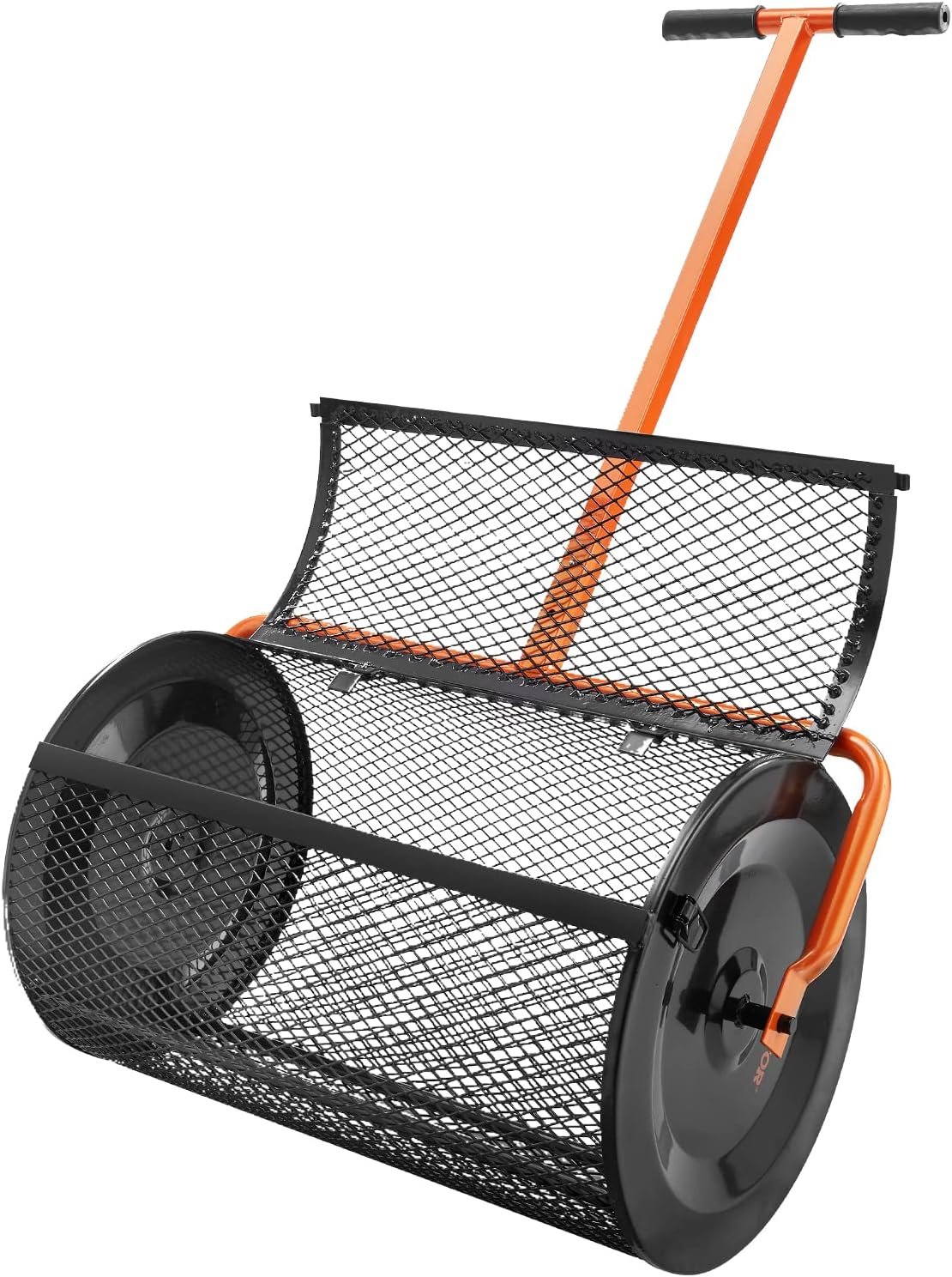 VEVOR Compost Spreader, 24.4-25.6″ Height Adjustable Handle, 24″ Wide, Lawn and Garden Peat Moss Roller with Side Latches, Powder Coated Steel Mesh Basket for Spreading Manure, Topsoil, Black