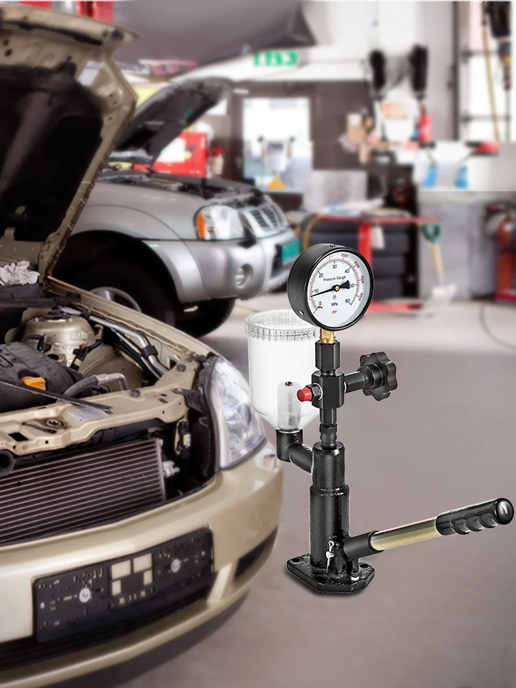 The fuel injection nozzle tester is made of selected high-quality materials to ensure a long-last use. It has a sturdy cast-iron body, stainless pressure gauge and a plastic transparent oil cup.