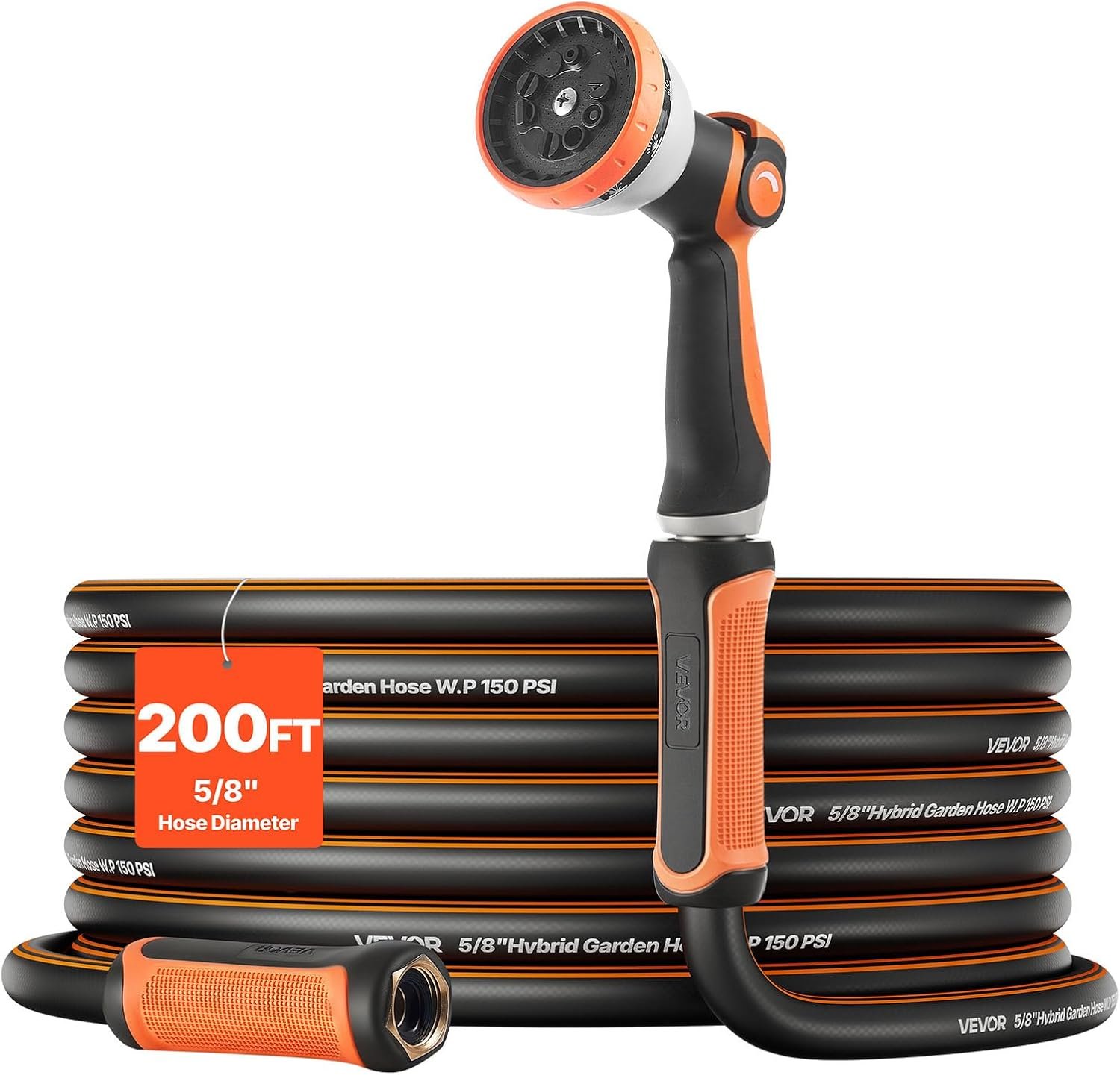 VEVOR Garden Hose, 200 ft 5/8″ Heavy Duty Rubber Water Hose with 10 Mode Nozzle, 150PSI Working & 600PSI Burst, Flexible & Non-kink Outdoor Waterhose with 3/4″ Fitting, Lightweight Hoses for Gardening