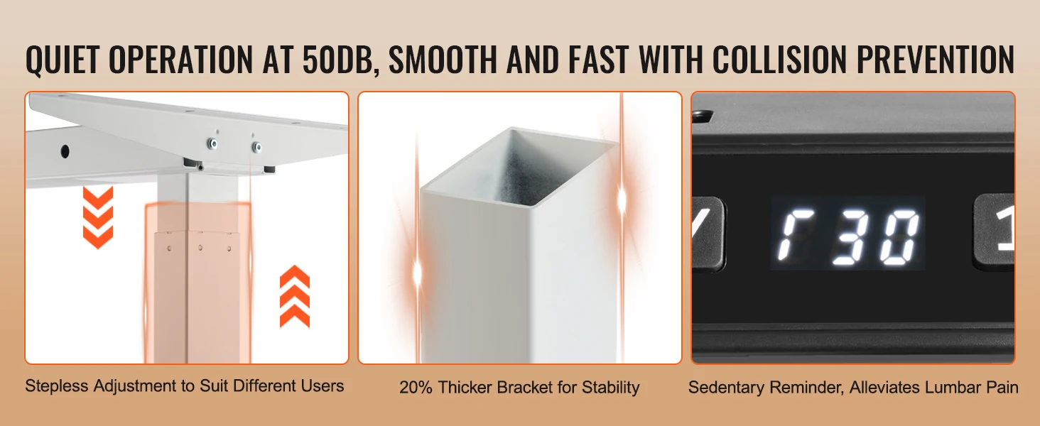 Sturdy and Stable: With a robust weight capacity of 276/176 lbs (125/80 kg), crafted from premium SPCC material, this desk stands strong, durable, and operates quietly. Its legs are reinforced by 20% for a comfortable and efficient workspace.