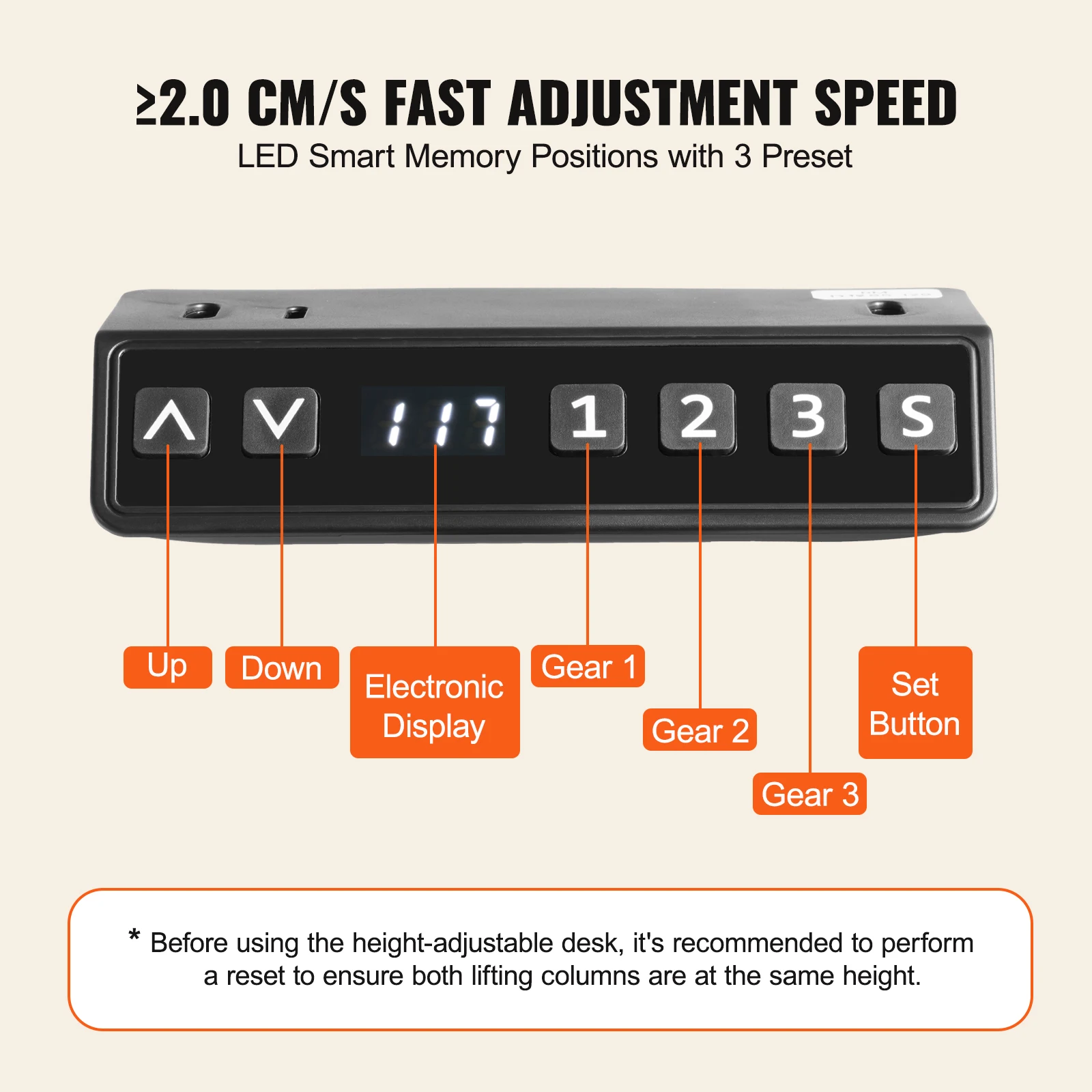 Rapid Height Adjustment: Experience swift transitions with a lifting speed of â‰Â¥0.79/1.26 in /s (2.0/3.2 cm/s), complemented by an LED controller capable of memorizing three preset heights for easy toggling between work modes. The intuitive button interface and USB port for charging make operation a breeze.
