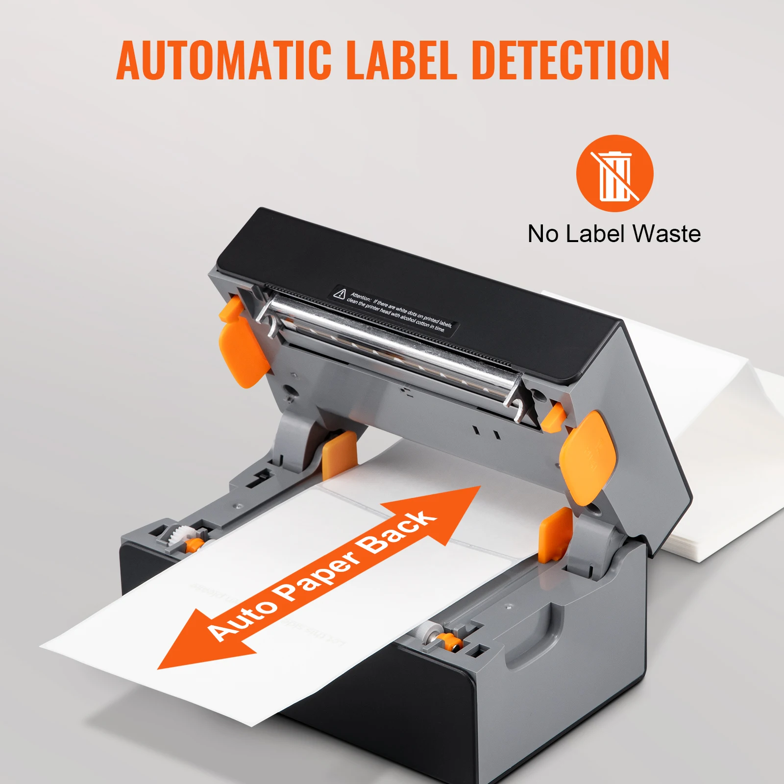 Automatic Label Identification: This desktop label printer can catch the labels and feed them into the printer automatically. Just close the lid and insert the paper from the back of the printer, then watch as the machine identifies the labels effortlessly. Besides, it also features an automatic paper return function, which can return unsuitable labels and avoid wasting them. Start saving and improving with VEVOR.
