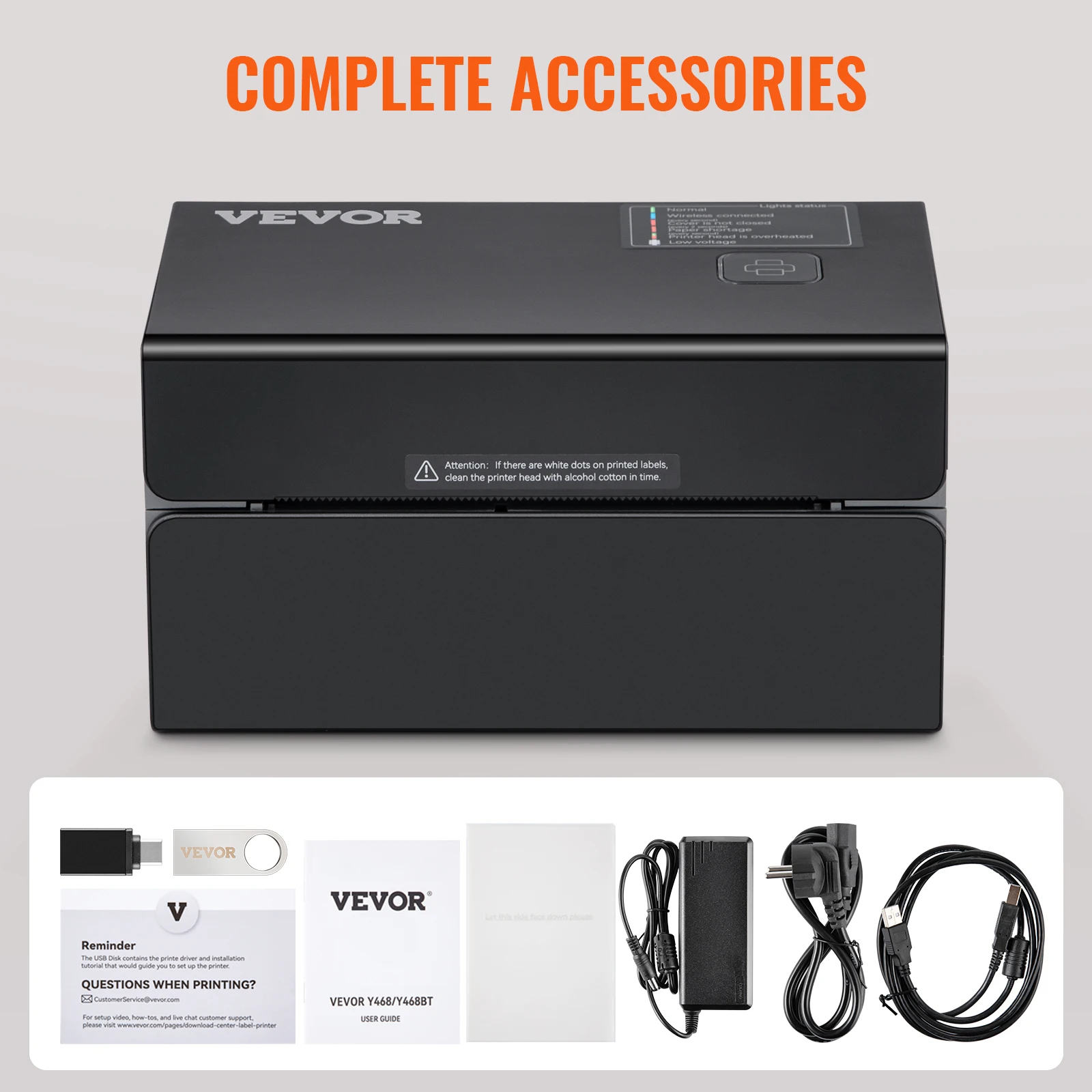 Our package includes 1 x thermal label printer, 1 x power cord, 1 x USB cable,1 x USB flash disk,1 x USB-C converter, 30 x label papers, 1 x card for opening the box, and 1 x user manual.