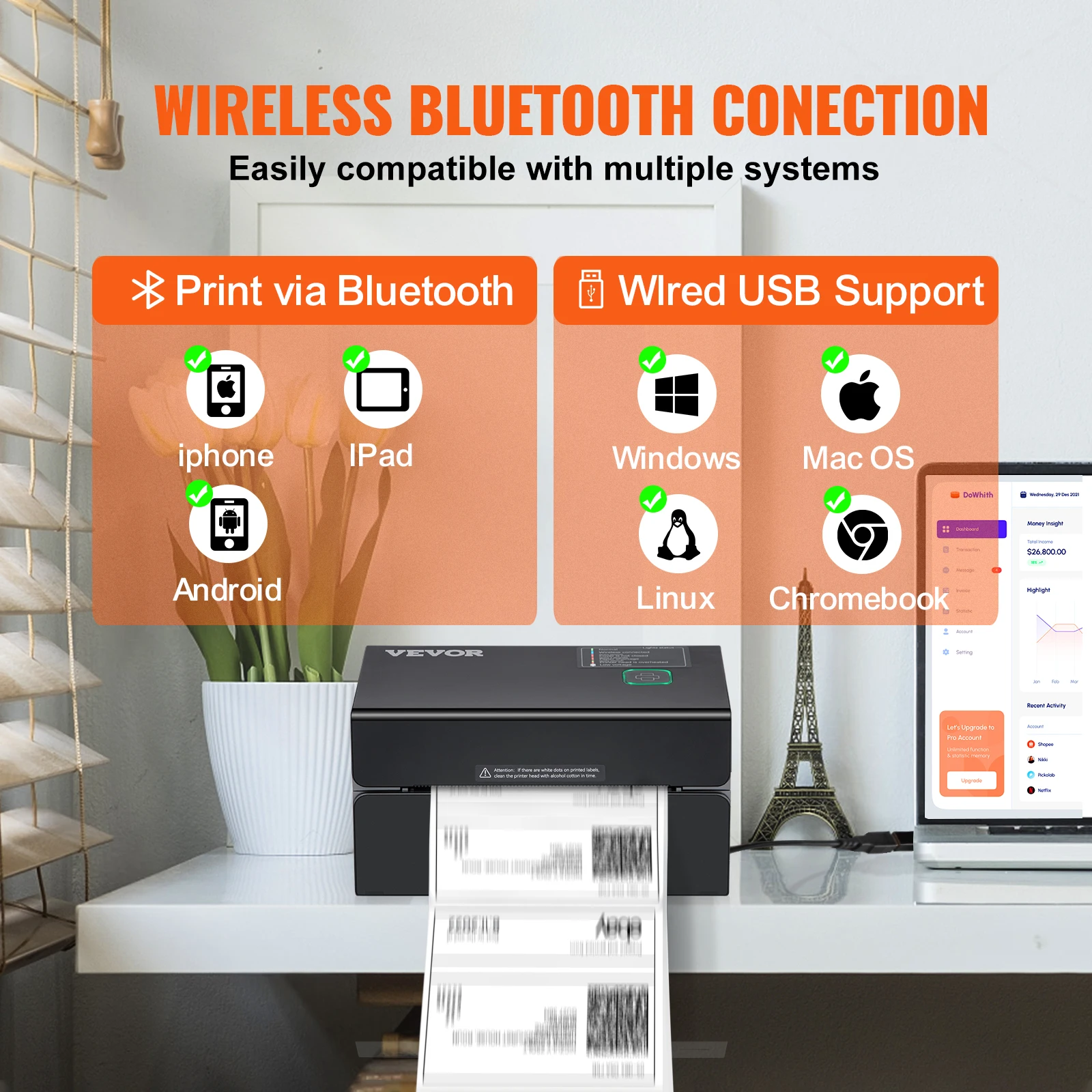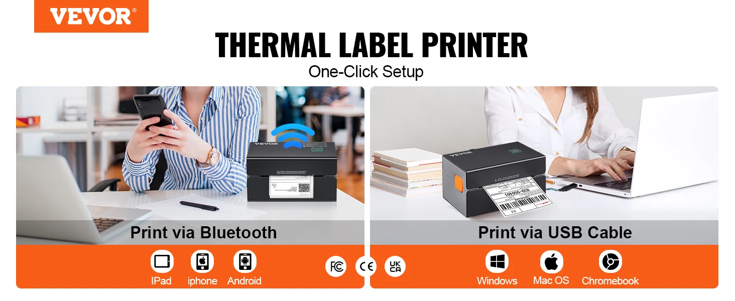Wireless Bluetooth Connection: Get rid of those wires and start experiencing Bluetooth! Compare with other label printers printed via USB, VEVOR’s thermal printers can be connected by Bluetooth or USB. This label printer is compatible with IOS, Android, Windows, Mac OS, Linux, and Chromebook. Please download the driver as instructed before printing.
