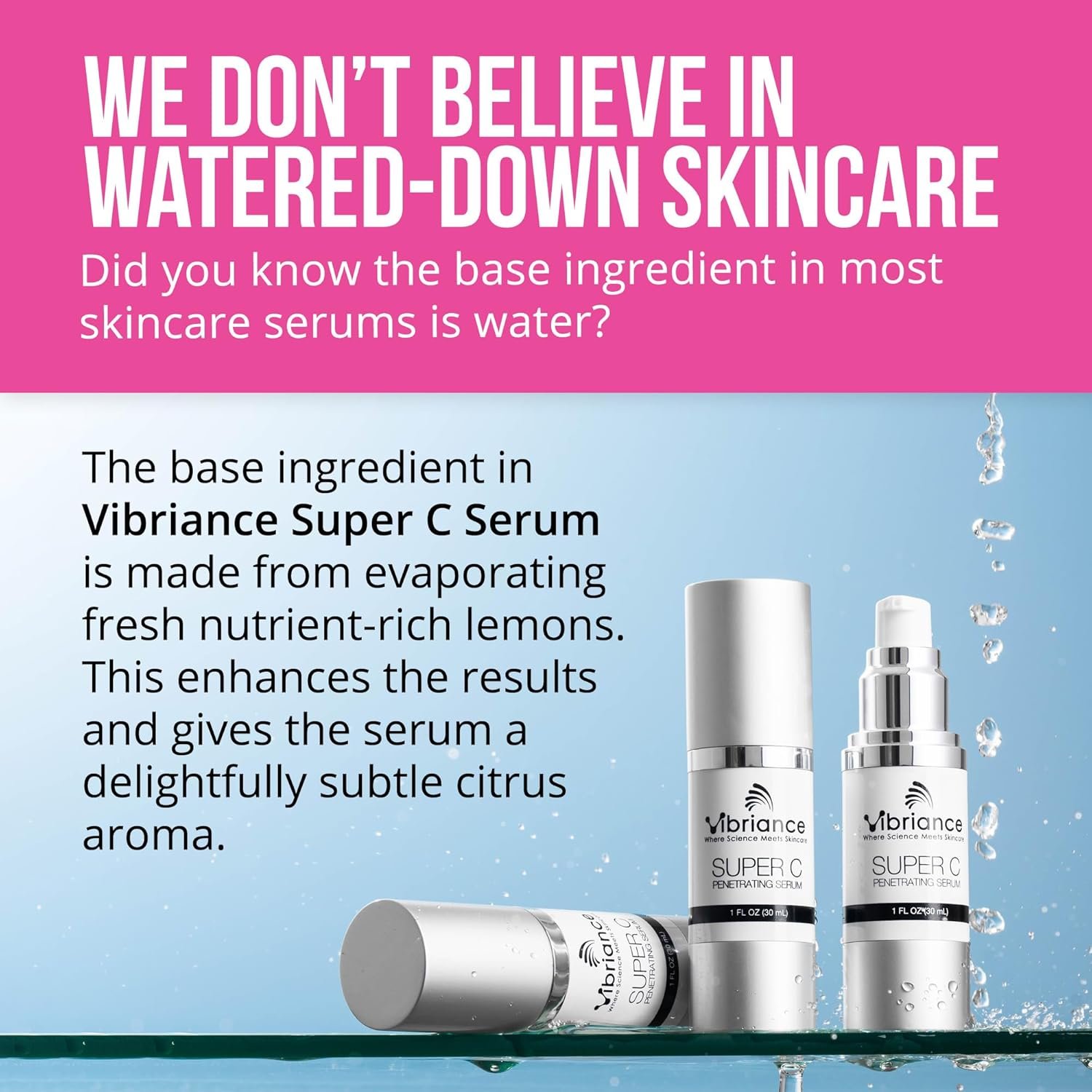 Not just water – When it comes to vitamin C face serum, the ordinary face serum is watered down and ineffective. Our formula, on the other hand, is a high-quality and highly concentrated vitamin C serum. The base ingredient in Vibriance Super C Serum is made from evaporated lemons, while other brands’ base ingredient is simply tap water.