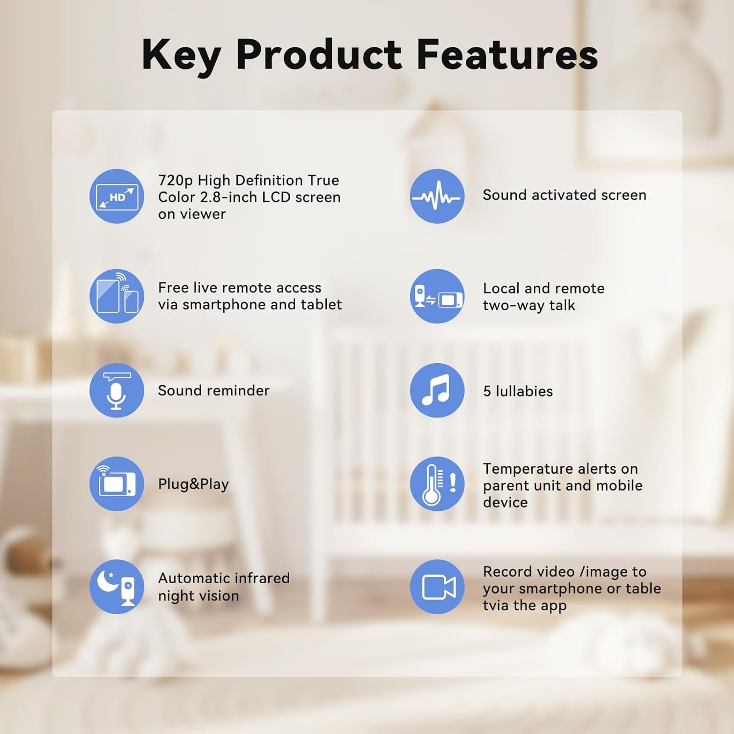 【Crystal Clear Audio and Video】: It’s a Baby Monitor With Camera and Audio, Which Delivers Real-time Video And Clear Audio of Your Baby. With Exceptional Image Quality, You Can See Every Detail And Hear Every sound, Ensuring You Never Miss a Moment of Your Little One.