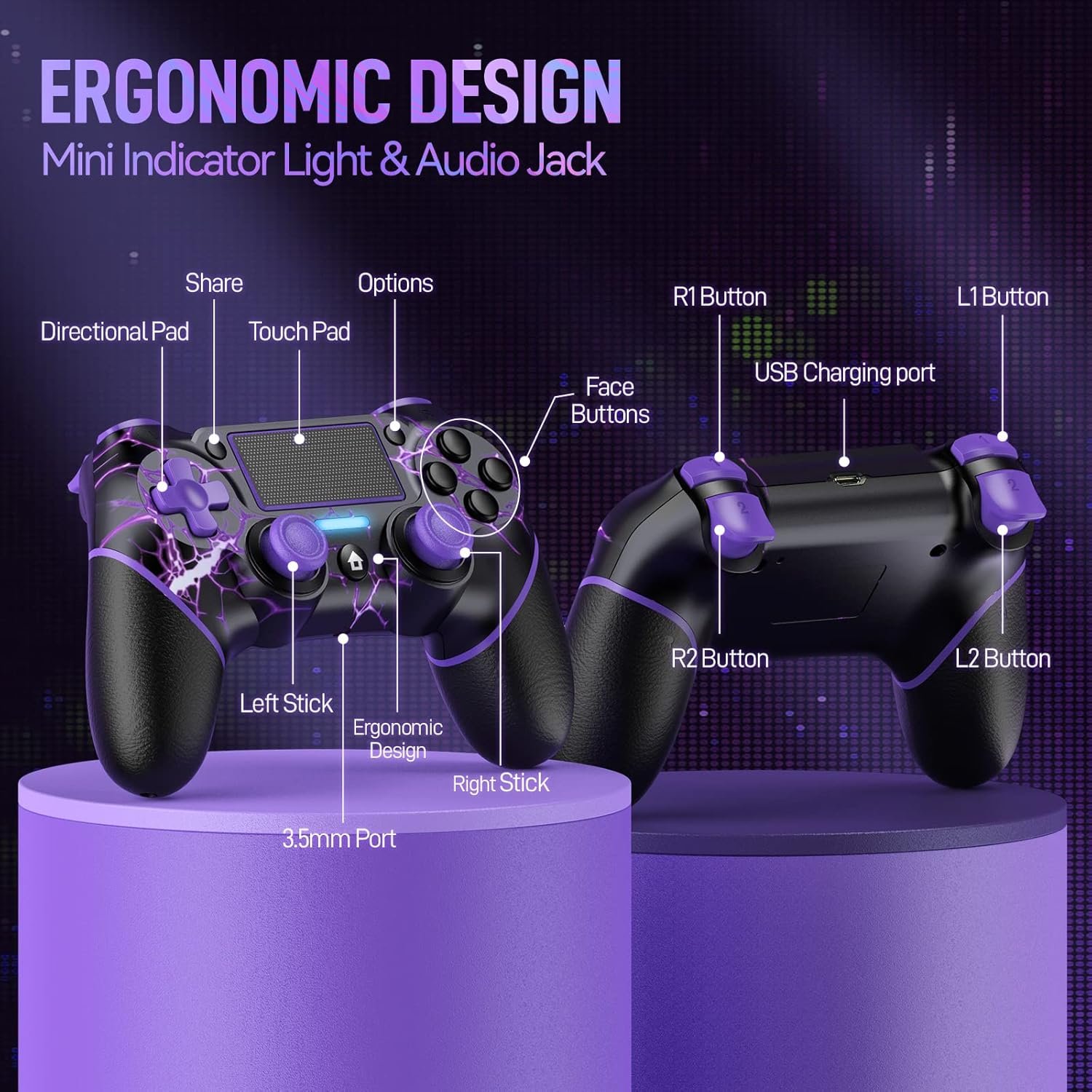Electrifying design: Stand out from the crowd with our controller’s mesmerizing purple lightning design. Say goodbye to sweaty hands during intense gaming sessions, as our controller boasts an anti-slip grip for maximum comfort and control