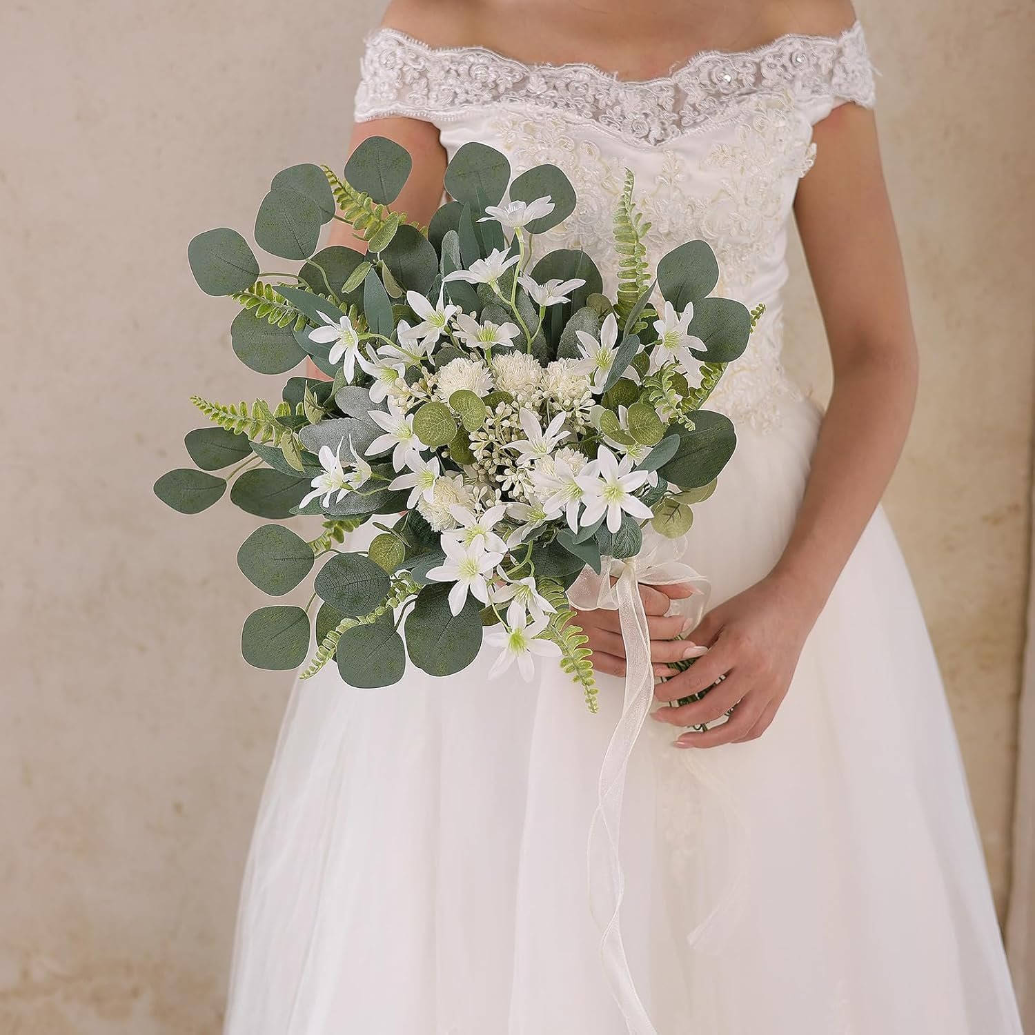 Package Including: 65 pcs with 8 Kinds; Fern Leaf x10, Silver Dollar Eucalyptus x10, Eucalyptus x10, Willow Leaves x10, Eucalyptus Fruit x10, Lamb’s Ear Leaf x5 ,Ball Chrysanthemum x5, Oncidium Flowers x5.