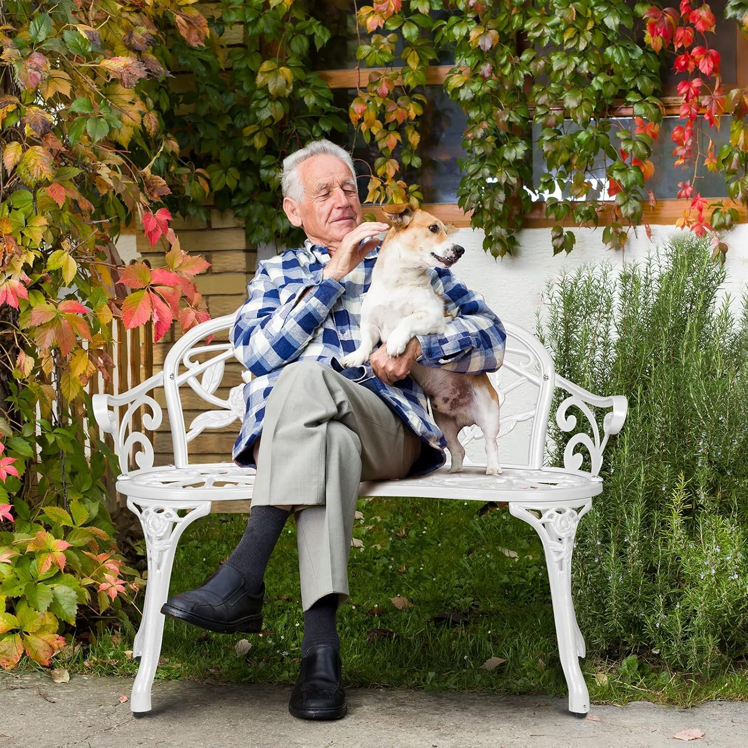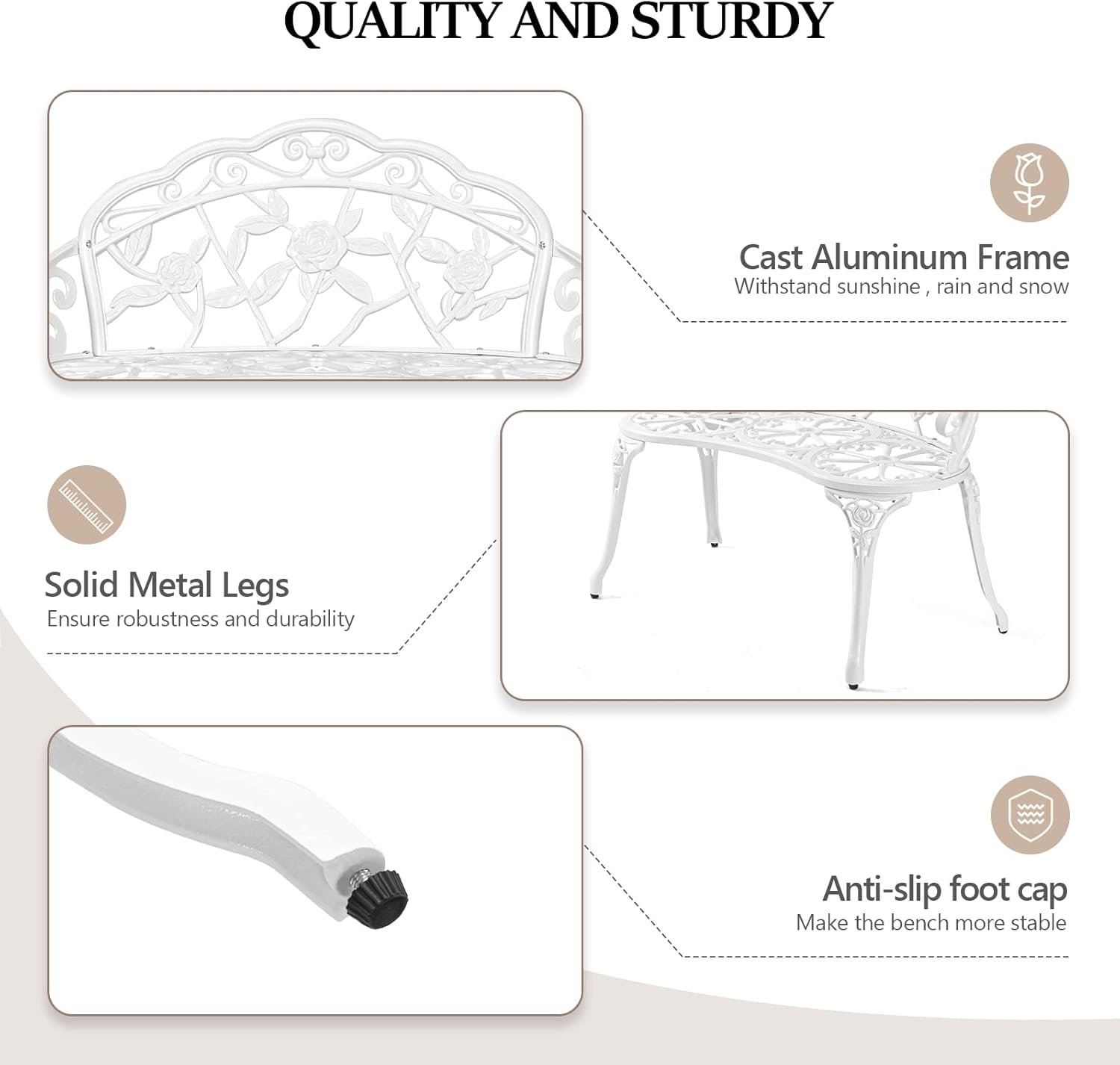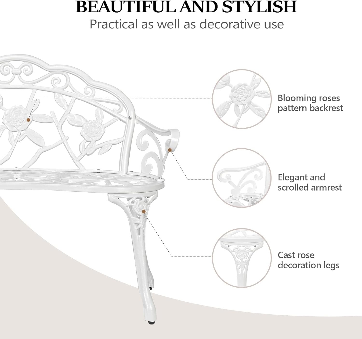 VINGLI 38.5″ Patio Park Garden Outdoor Metal Rose Bench,Cast Iron Cast Aluminium Frame Antique Finish Chair,Accented Lawn Front Porch Path Yard Decor Deck Furniture for 2 Person Seat(White