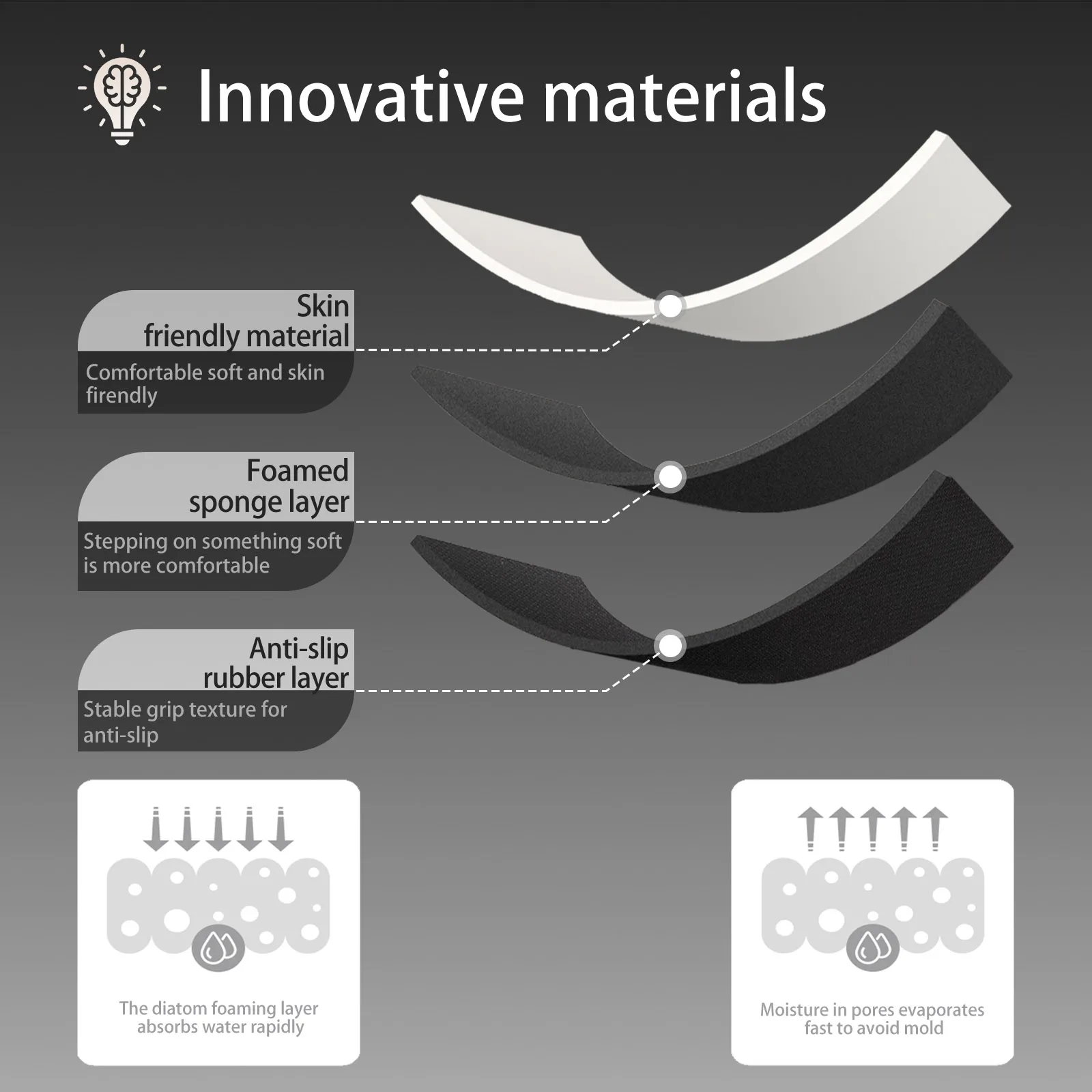 1.Made of high quality Diatom mud fabric+sponge+rubber, soft, comfortable,skin-friendly, environmental, durable,reusable,Antibacterial,Anti-slip