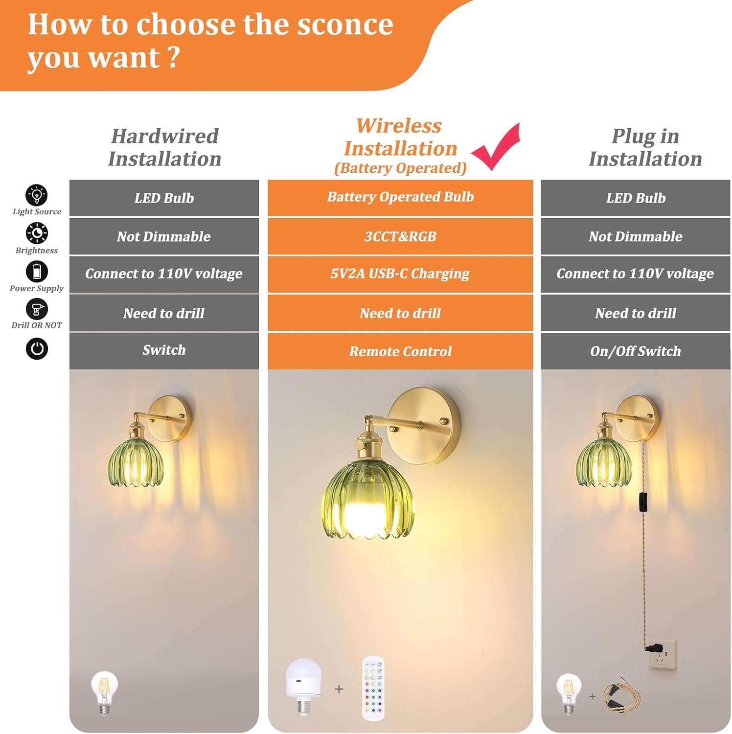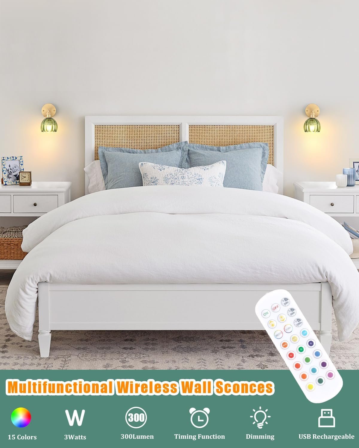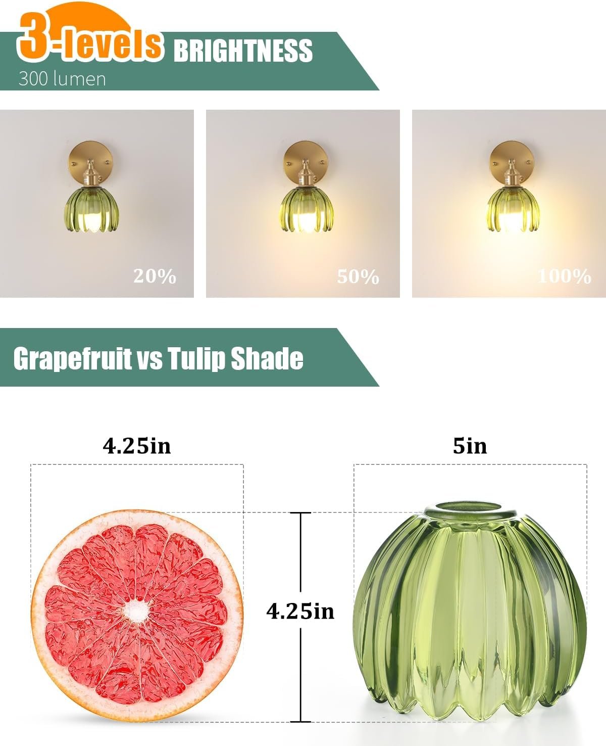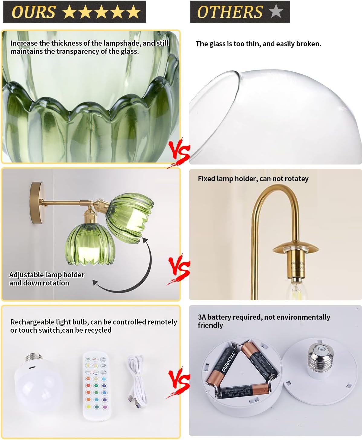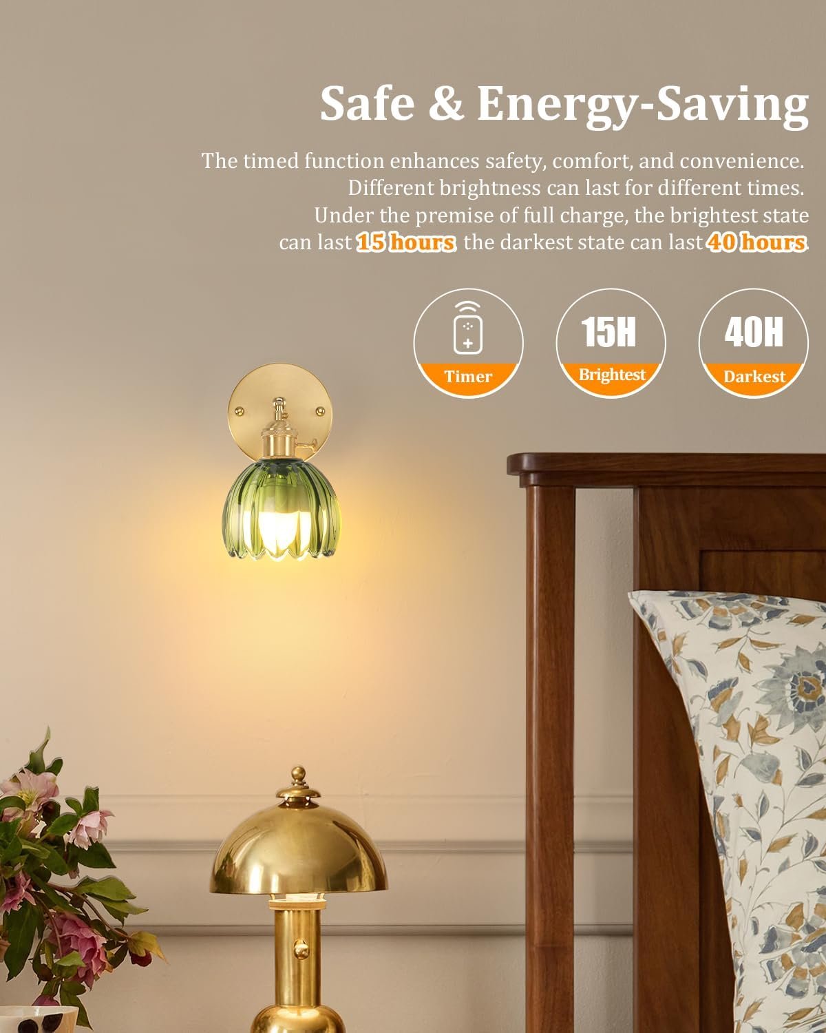 Vintage Battery Operated Wall Sconce with Green Tulip Glass Lampshade Wireless Rechargeable Battery Powered Wall Light with Remote Control for Bedside Bedroom Doorway, Set of 2