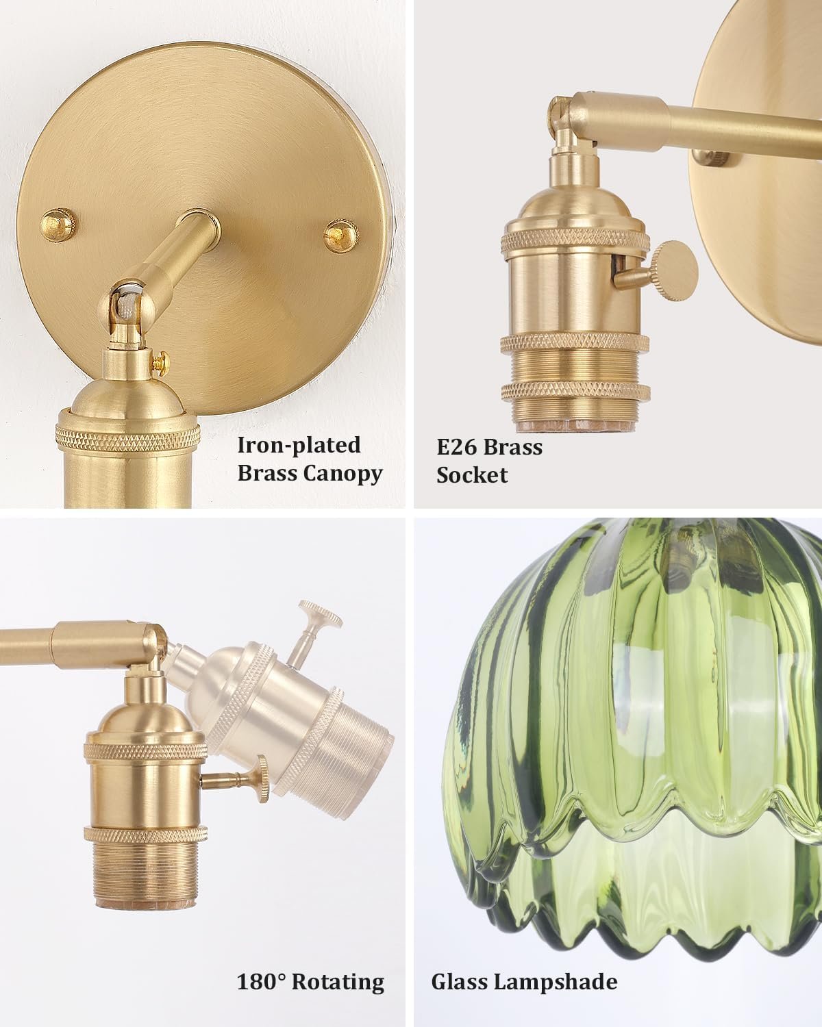 The elegant wall lighting has glass material lampshade and brass holder, reflecting a retro and industrial feeling,and the soft lighting could light up the night.
