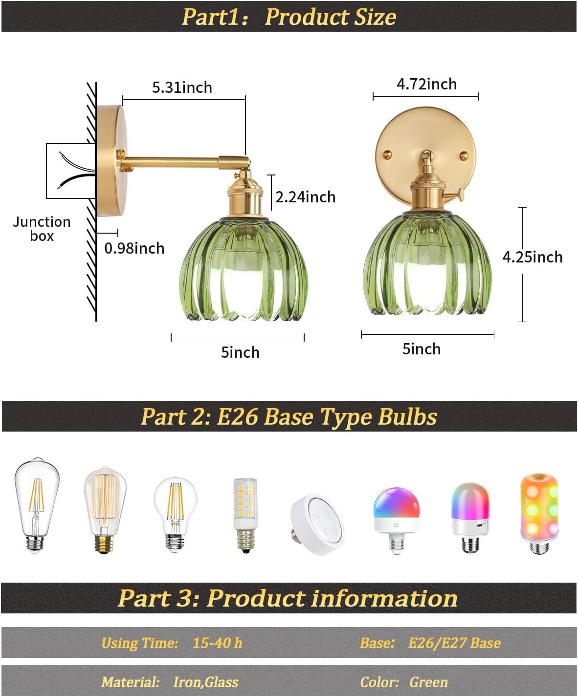 Style Tulip Material Glass and Brass Color Green Base Size 4.72″ Dia.(Fit Standard Box) Socket E26 Standard (Included) Lampshade Size 5.91″ Dia * 4.33″Height