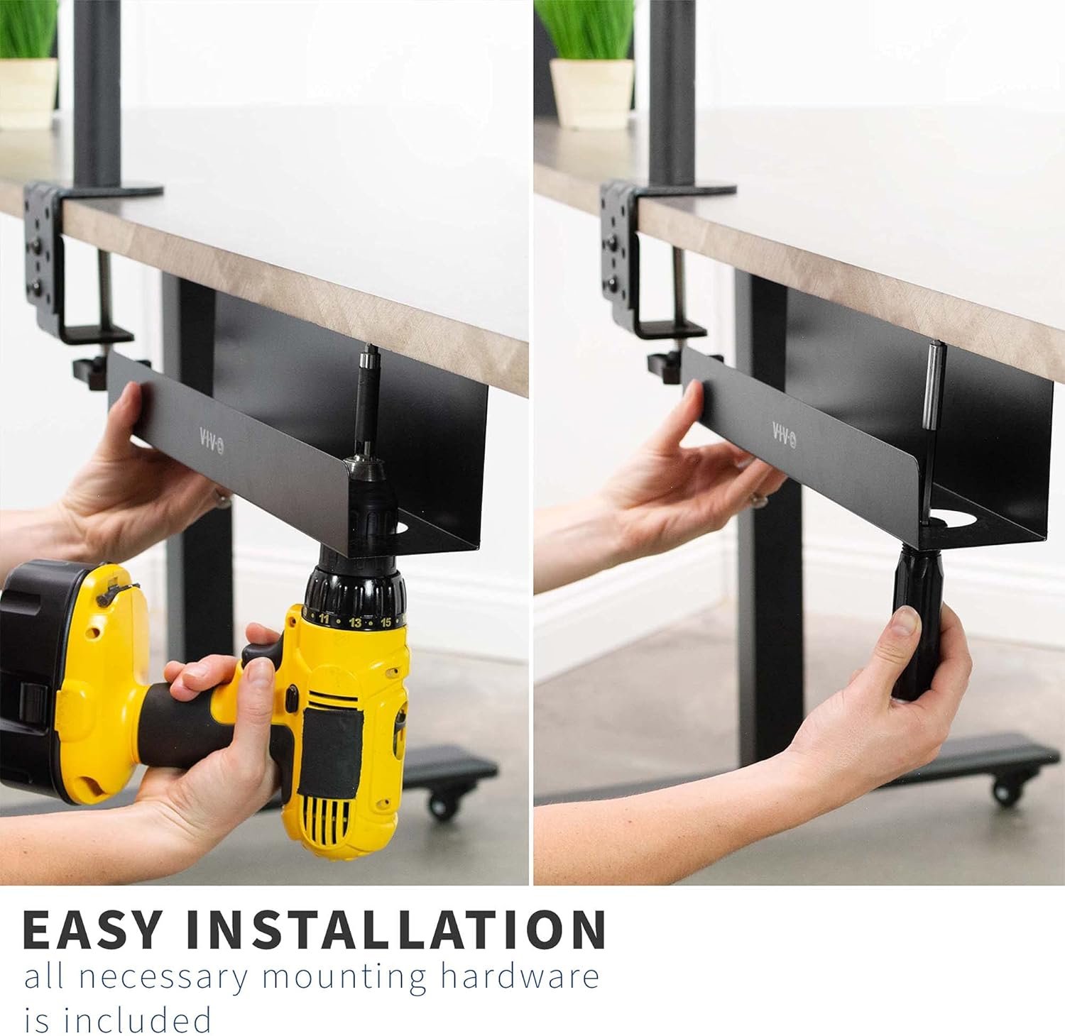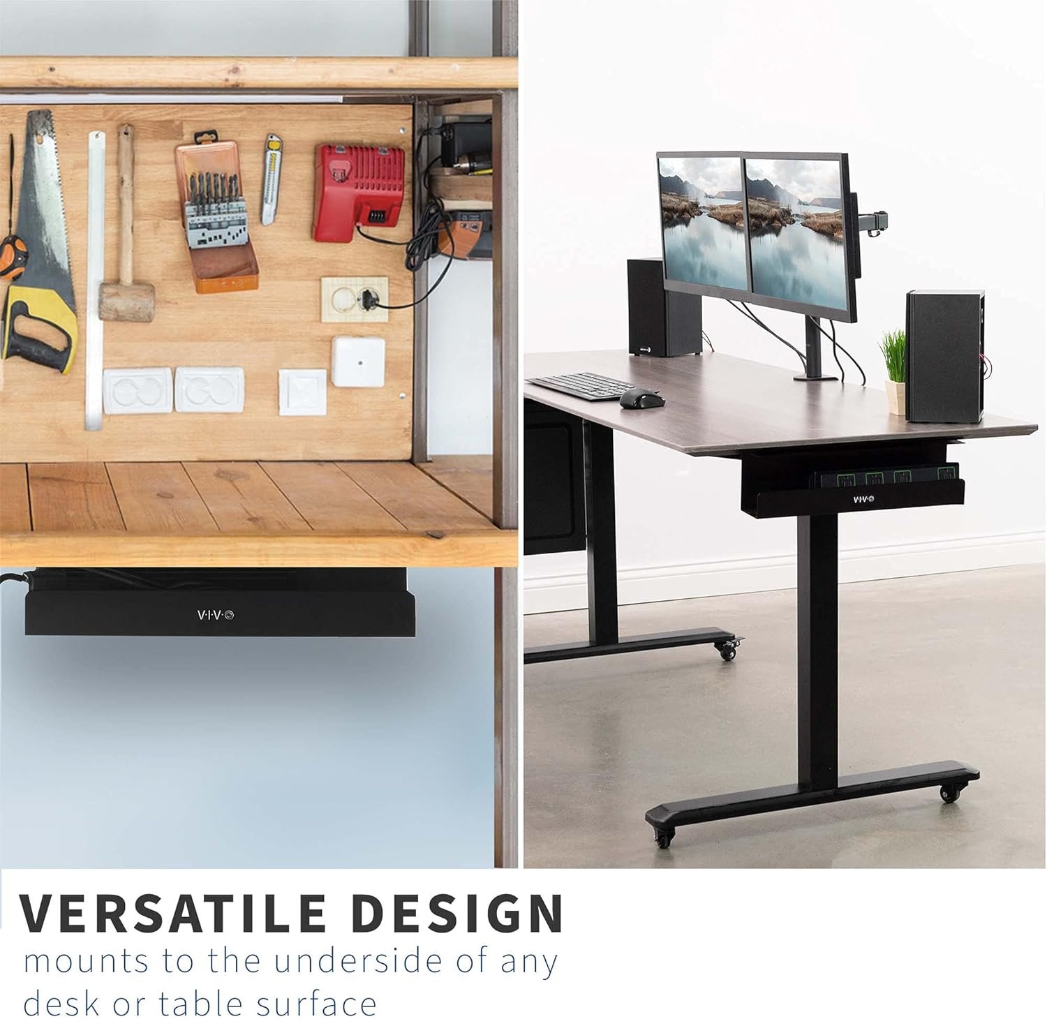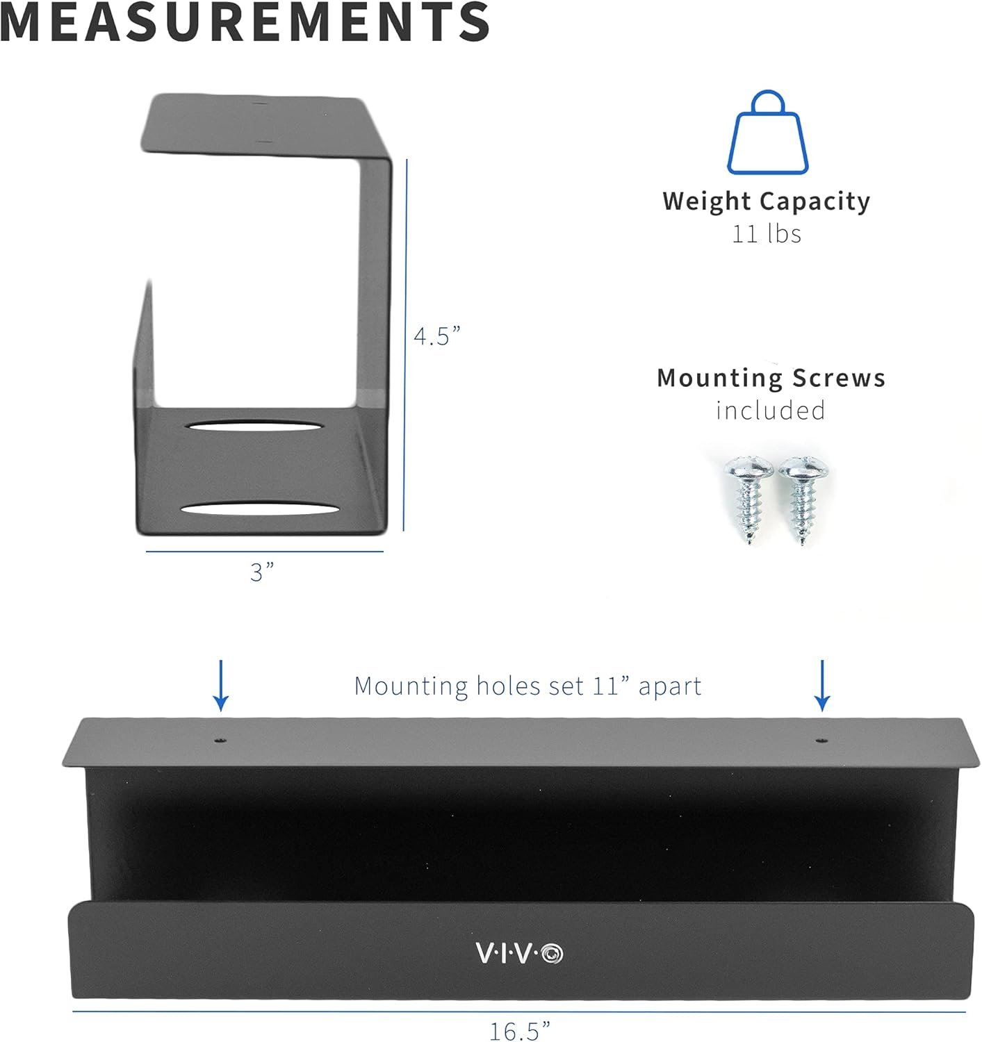 Under Desk Mounting – Installs underneath any wood or particle board desk / table top with the provided screws (mounting holes are 11” apart). The partially closed design keeps your cords and devices well hidden, while the front opening makes adding or removing cables a breeze.