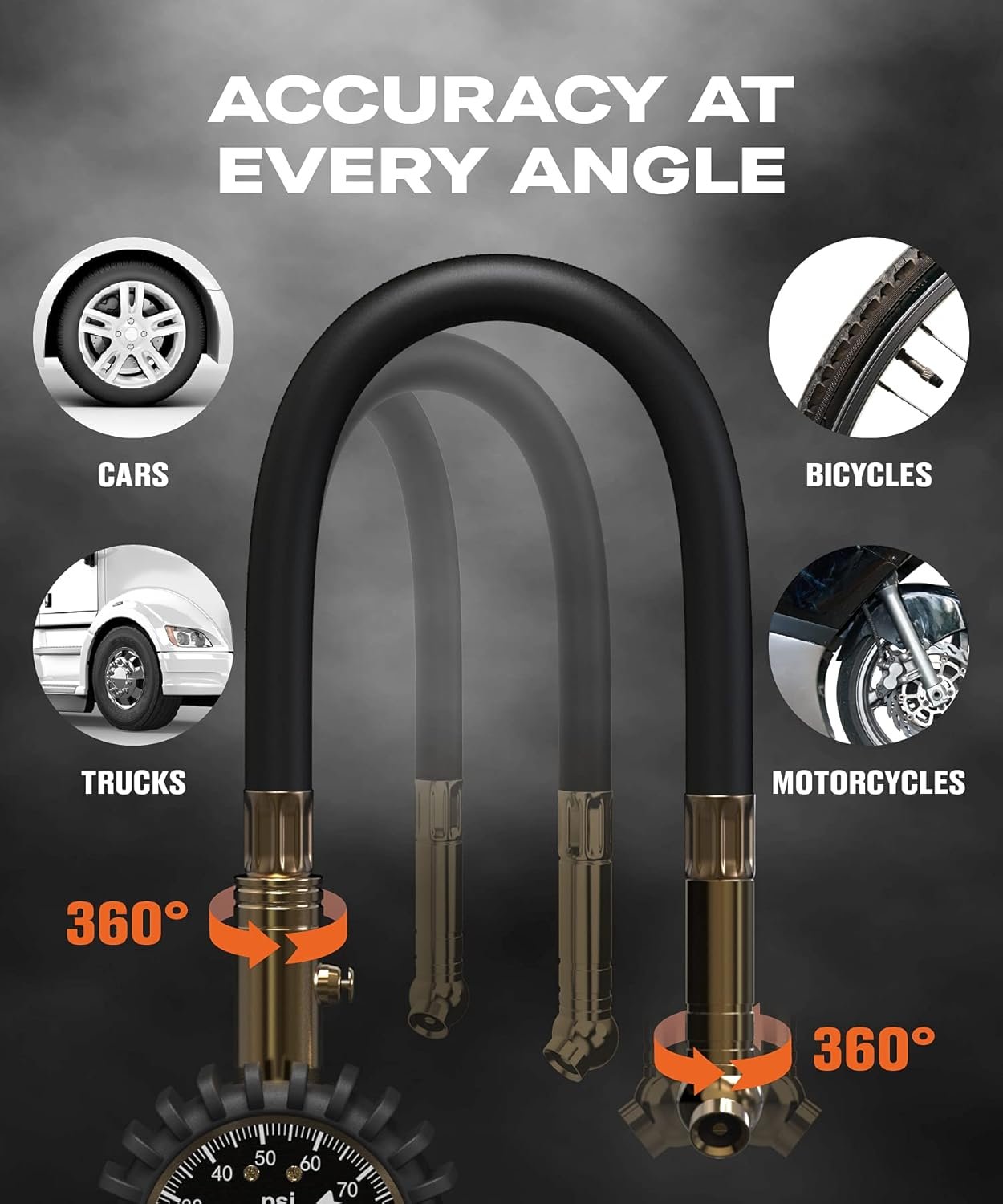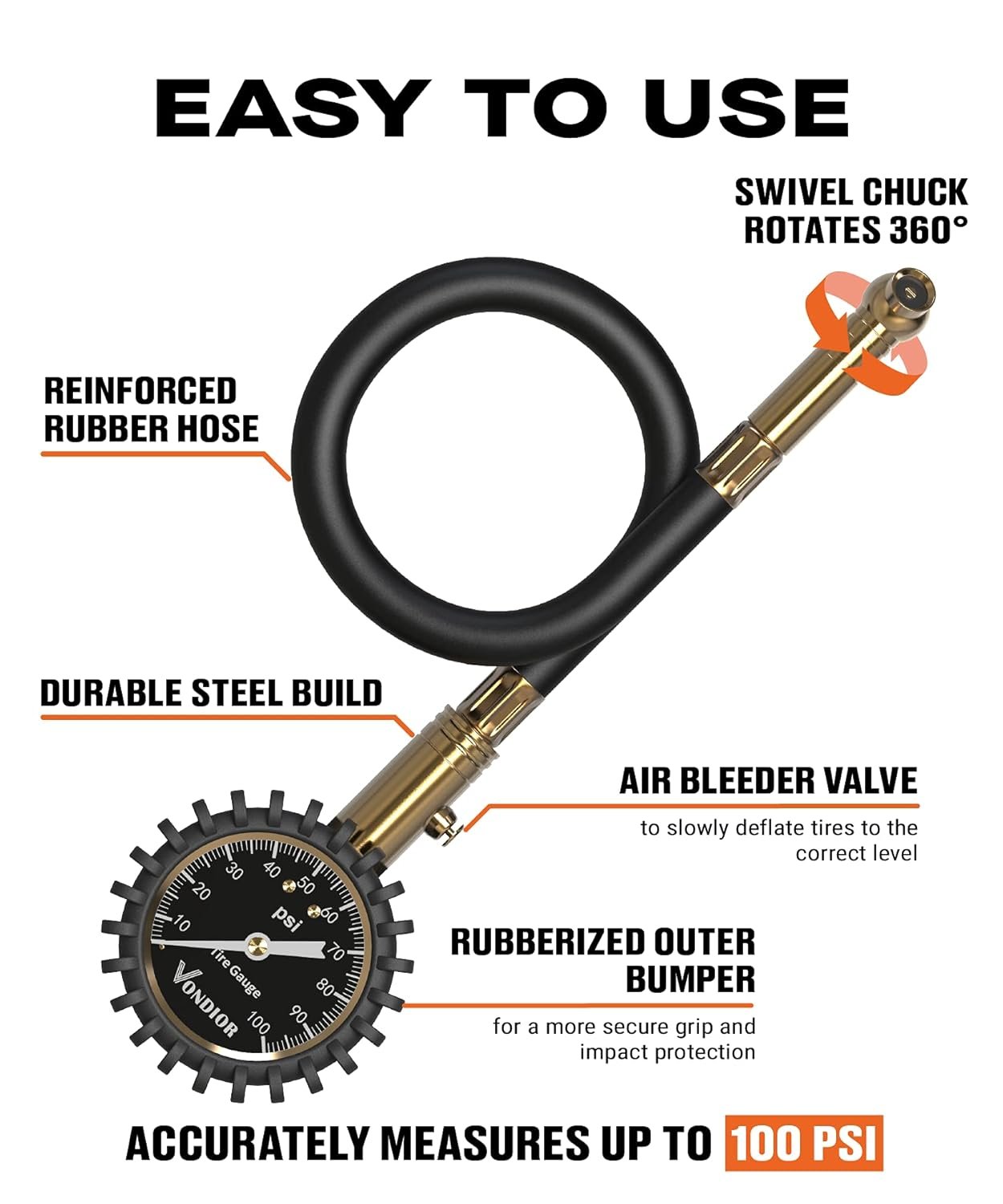 HIGH PERFORMANCE LOW MAINTENANCE – It is your pride and joy. Your car is one of your partners in life. Making sure it performs at its best takes tender loving care, which means essentially checking tire pressure regularly. But going to the garage or gas station is a hassle. Highly calibrated accurate to ±1% full scale of 100 PSI range VONDIOR tire pressure gauge will make sure your tires are good to go! Swiveling hose, rotating in two axis, gives easy access to the valve, for maximum convenience