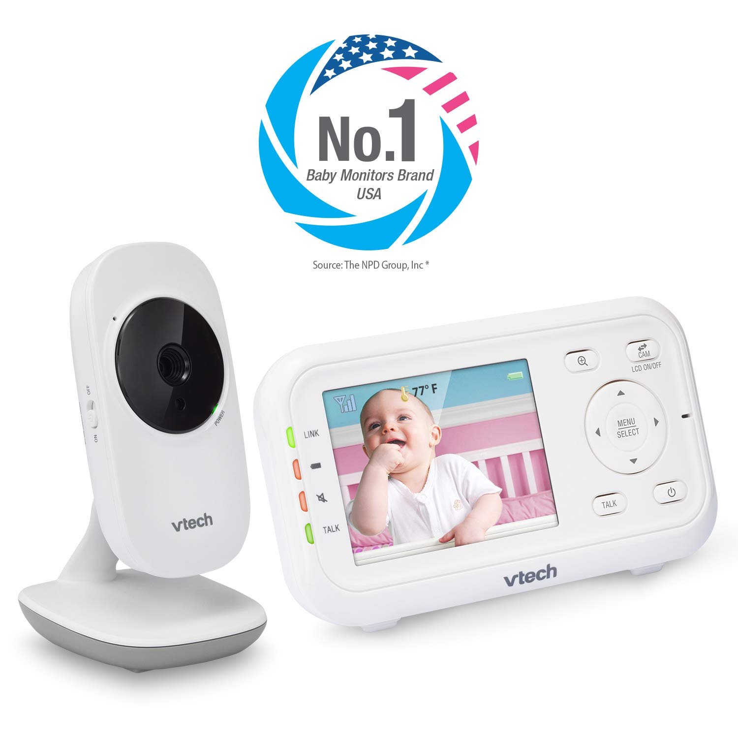 VTech Video Baby Monitor with 1000ft Long Range, Auto Night Vision, 2.8” Screen, 2-Way Audio Talk, Temperature Sensor, Power Saving Mode, Lullabies and Wall-mountable Camera with Bracket, White