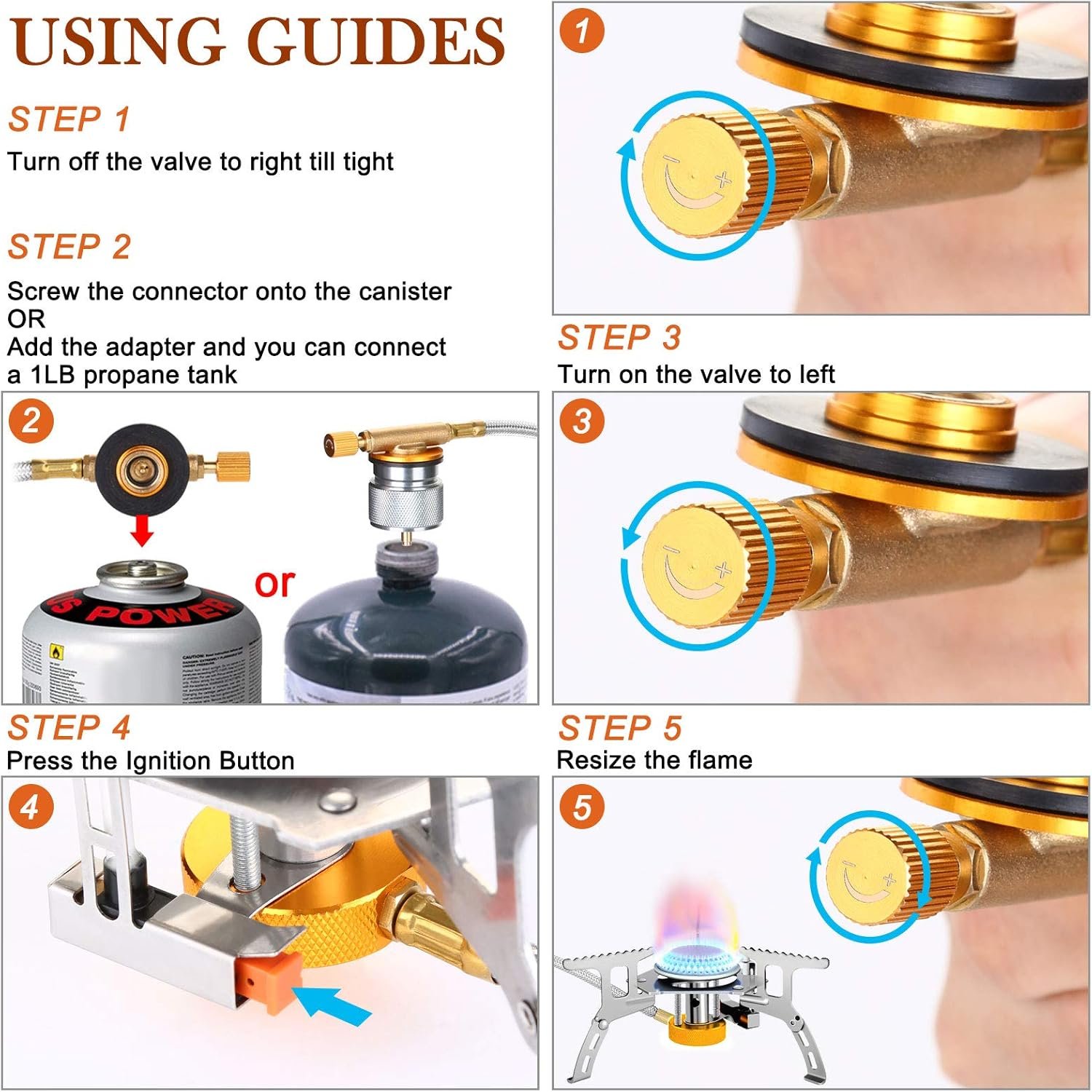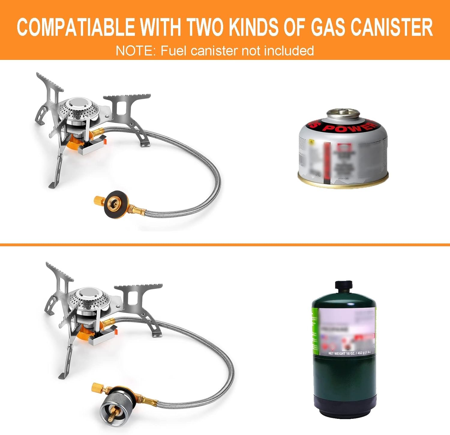 Compatiable with 2 Kinds of Gas Canister: Our camp stove is not only compatible with butane camping fuel gas canister, but also compatible with 7/16 threaded monobutane/butane-propane blend tank (EN 417) (You need to use the camping stove adapter which we provided)