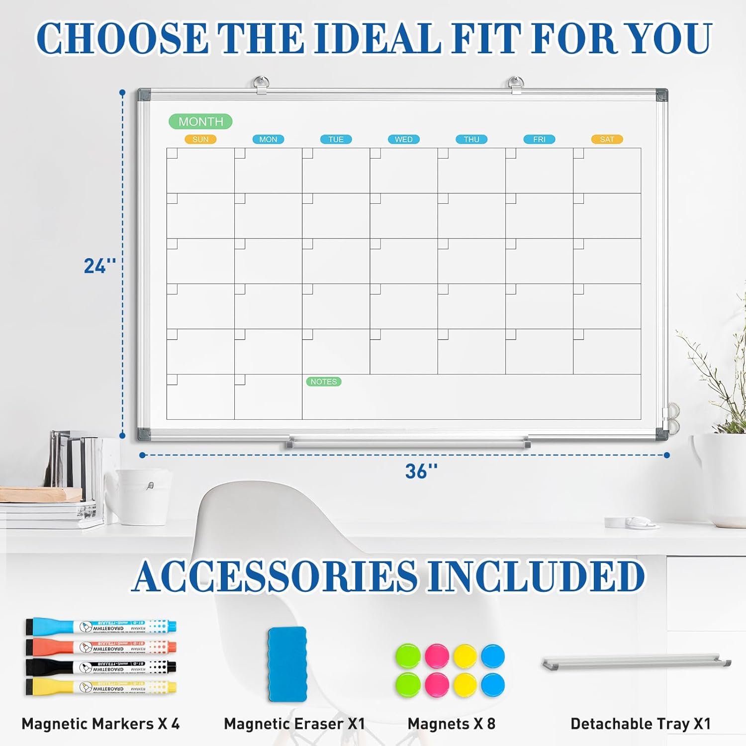 【All-inclusive Accessory Kit】Everything you need is included in the 36×24 inches calendar set—4 colours dry erase markers, 8 magnets, 1 eraser, a movable tray, hanging hooks and wall mounted screw kit. Start organizing your schedule immediately with no extra purchases required.